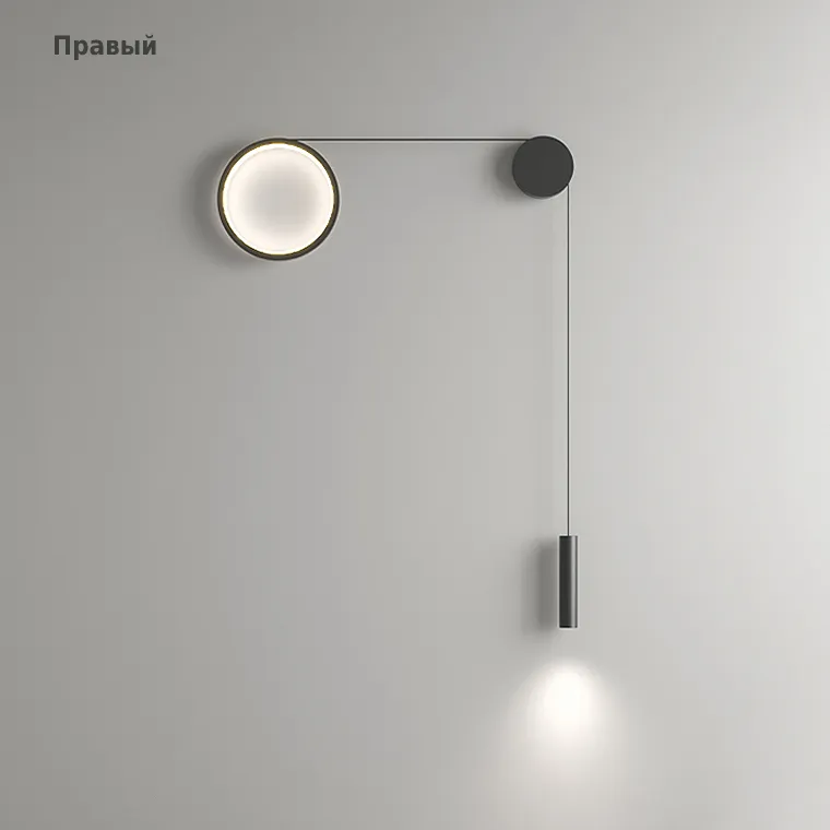 Парные светодиодные бра в виде комбинации светящегося кольца и спота на натяжном тросе