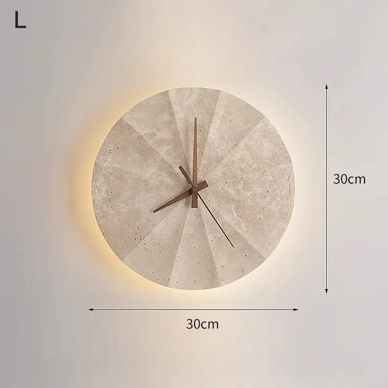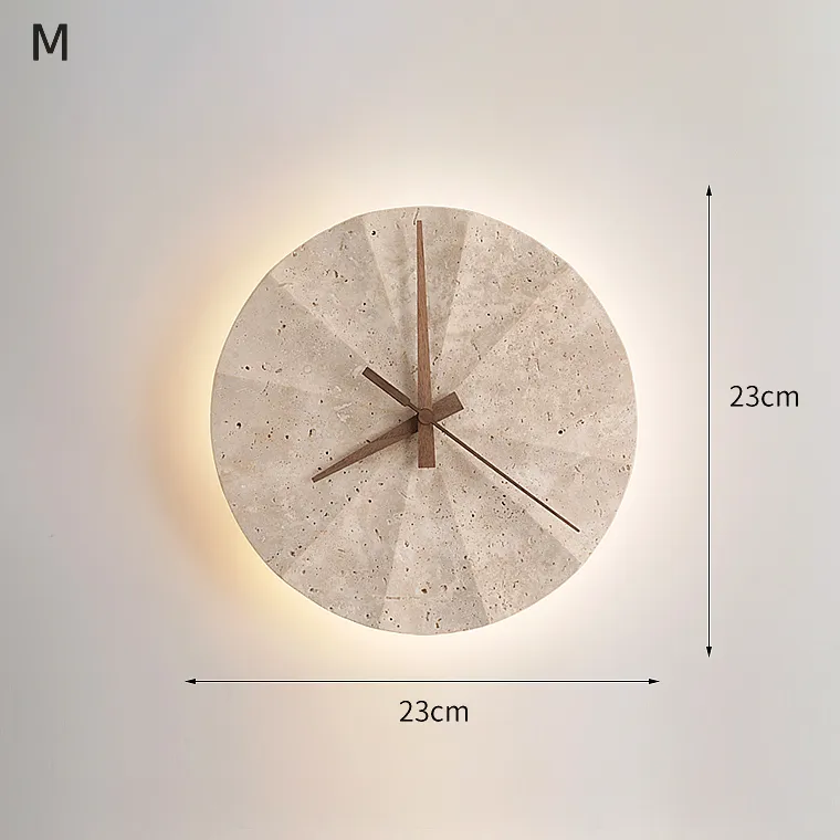 Настенный светильник с часами и фактурным дисковым корпусом из натурального травертина