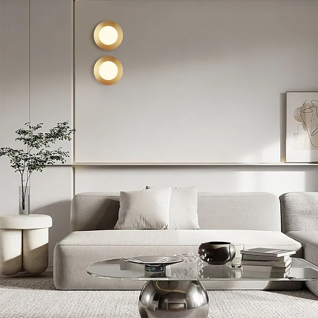 Настенные светильники выдерживаются обычно в пастельных, светлых, нейтральных тонах: бежевом, сером, белом, голубом. В качестве акцентных используются оттенки благородных металлов: серебристый, золотистый, бронзовый, латунный. Формы, как правило, симметричные, без углов и острых граней, чаще округлые.