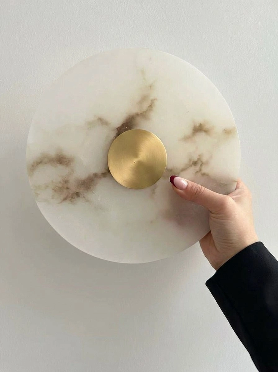 Искала что-то особенное для освещения зоны возле зеркала в прихожей — и нашла! Это бра превзошло все мои ожидания. Плафон из натурального мрамора выглядит просто потрясающе — у моего экземпляра невероятно красивый узор прожилок на нежном светлом фоне, каждый камень уникален. Латунный диск по центру добавляет изысканности и создает идеальный баланс между классикой и современностью.