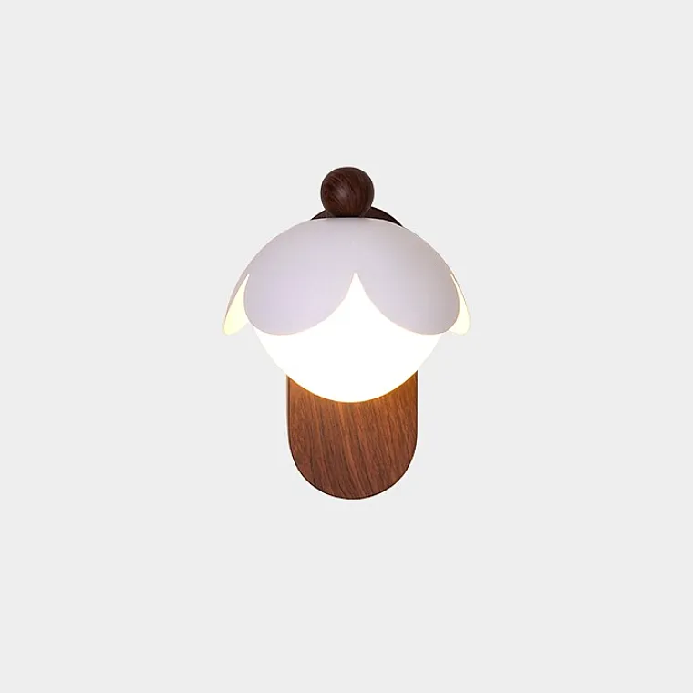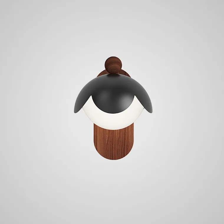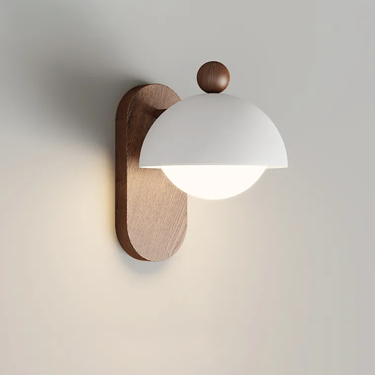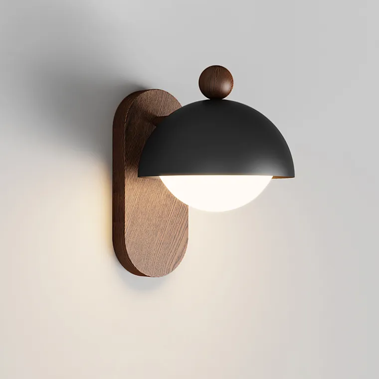 Серия компактных настенных светильников с плафоном купольной формы на овальном деревянном креплении