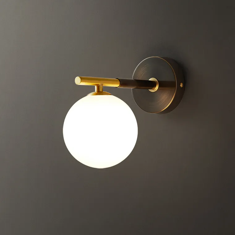 Серия настенных светильников с белым матовым плафоном шарообразной формы на черном кронштейне с латунной отделкой