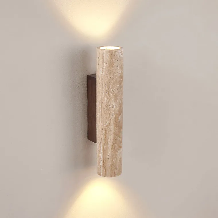 Бра LUBBE - это элегантный светильник, который привнесет природные и натуральные элементы в ваш интерьер. Он имеет цилиндрический корпус из камня травертина, добавляющий текстуру и уникальность в дизайн. Крепление выполнено из темного дерева в прямоугольной форме, что создает интересный контраст с каменным корпусом.