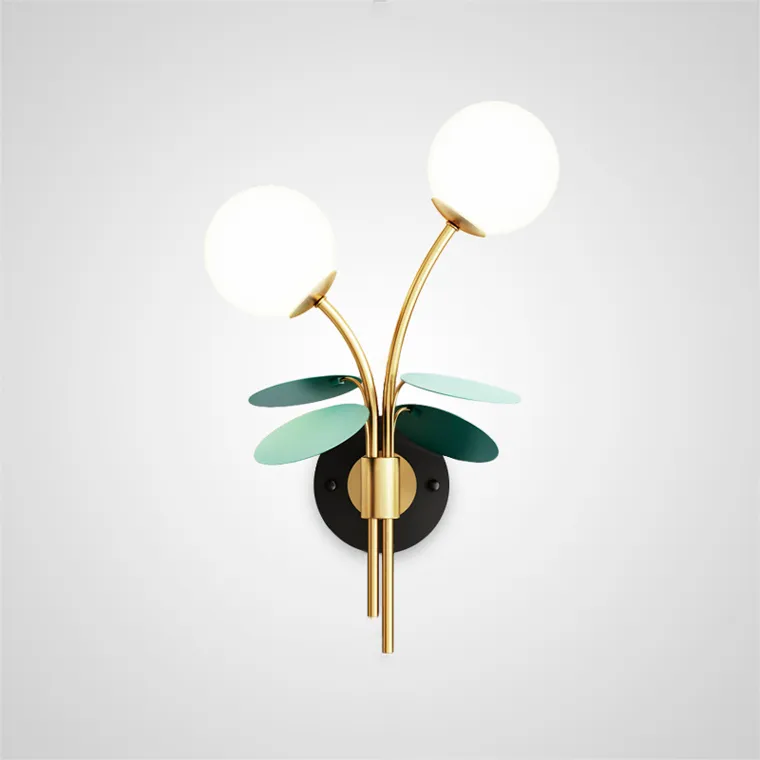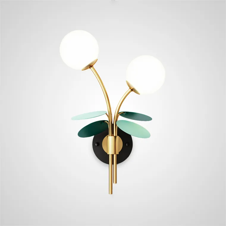 Серия бра с двумя белыми шарообразными плафонами и голубыми декоративными дисками на изогнутых рожках