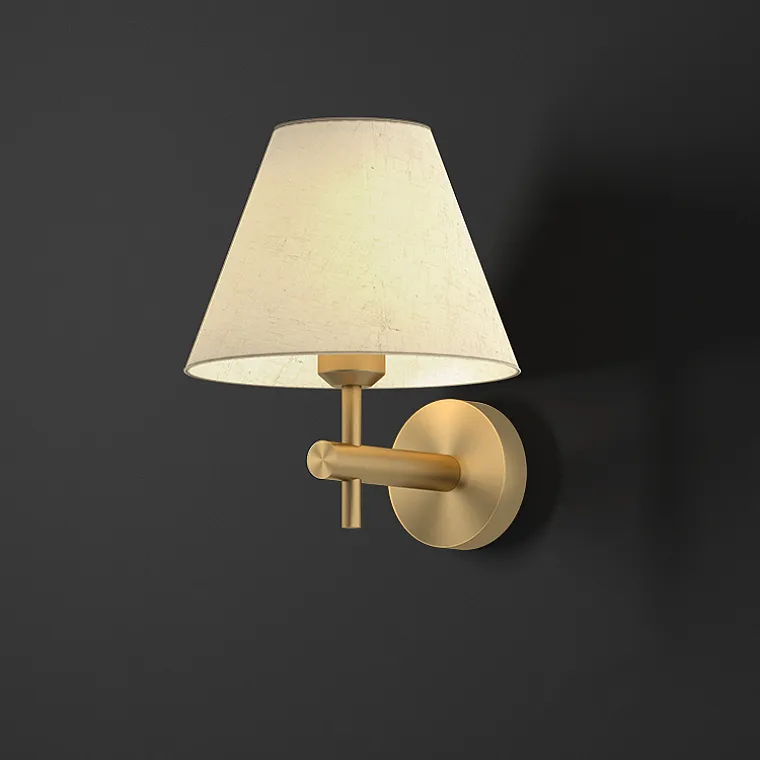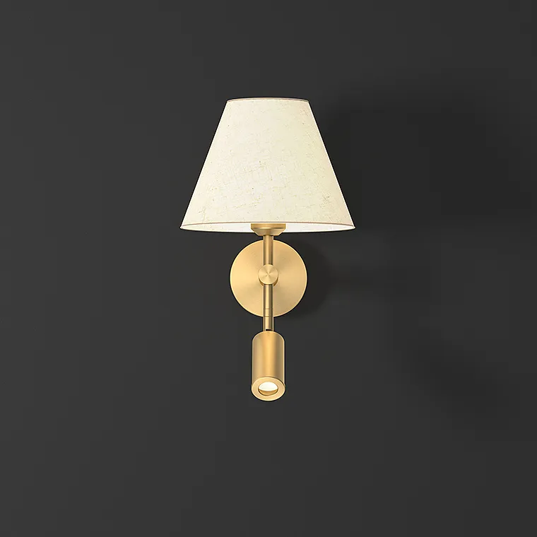 Серия настенных светильников с текстильным абажуром в форме усеченного конуса и дополнительным поворотным спотом