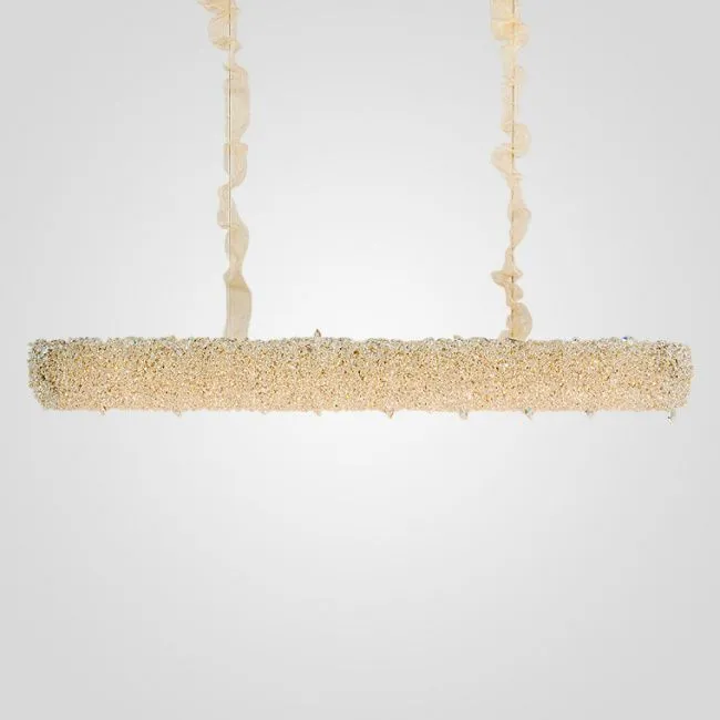 Абажур светильника представляет собой цилиндр, изготовленный из металлического золотого каркаса, украшенного гранеными хрустальными шариками. Эти шарики ярко переливаются на свету, создавая уникальный эффект, который привлекает внимание и добавляет шарма комнате.