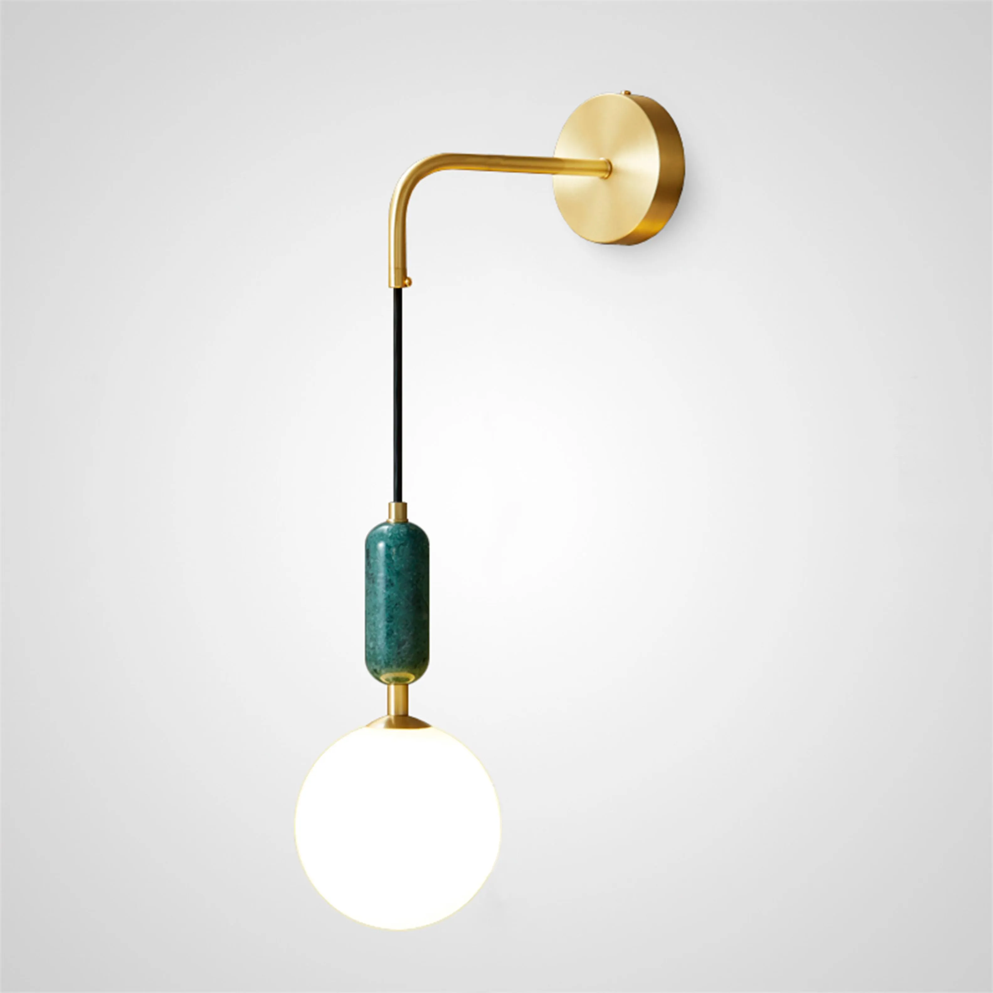 Серия настенных светильников с белым шарообразным плафоном из стекла на кронштейне с подвесом и мраморным декором