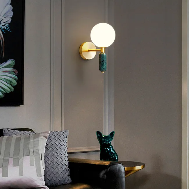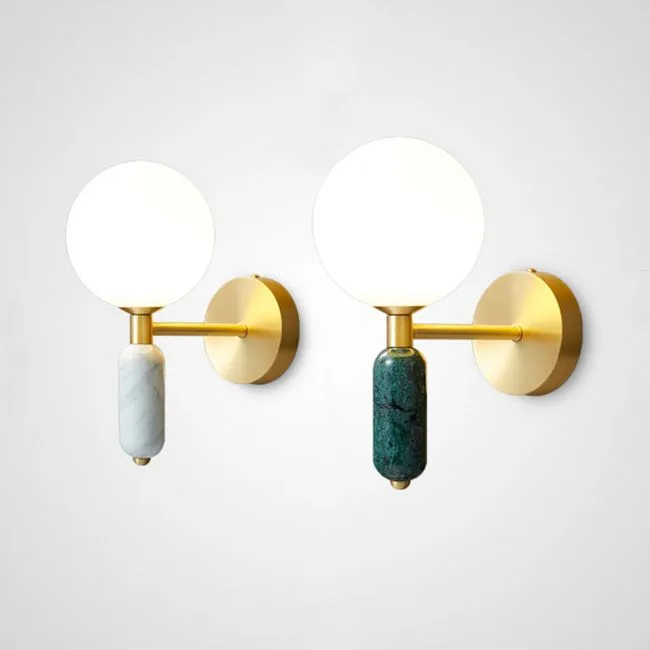 Серия настенных светильников с белым шарообразным плафоном из стекла на кронштейне с подвесом и мраморным декором
