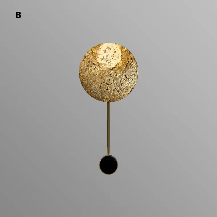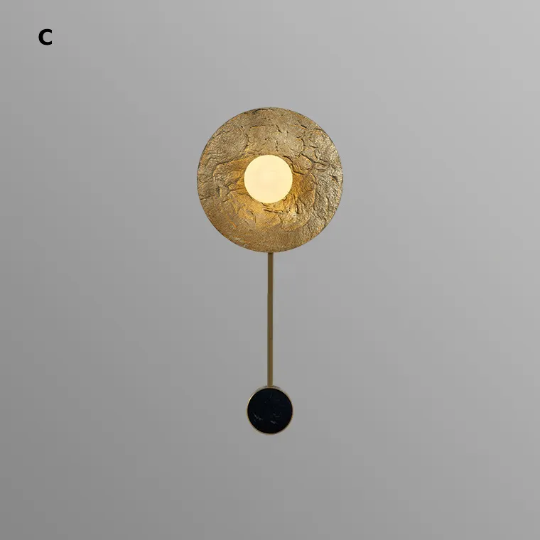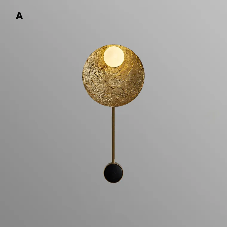 Настенный светильник на вертикальной стойке в форме металлического диска с эффектом сусального золота и шарообразным плафоном