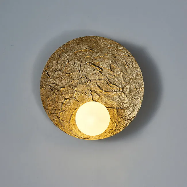 Настенный светильник на вертикальной стойке в форме металлического диска с эффектом сусального золота и шарообразным плафоном