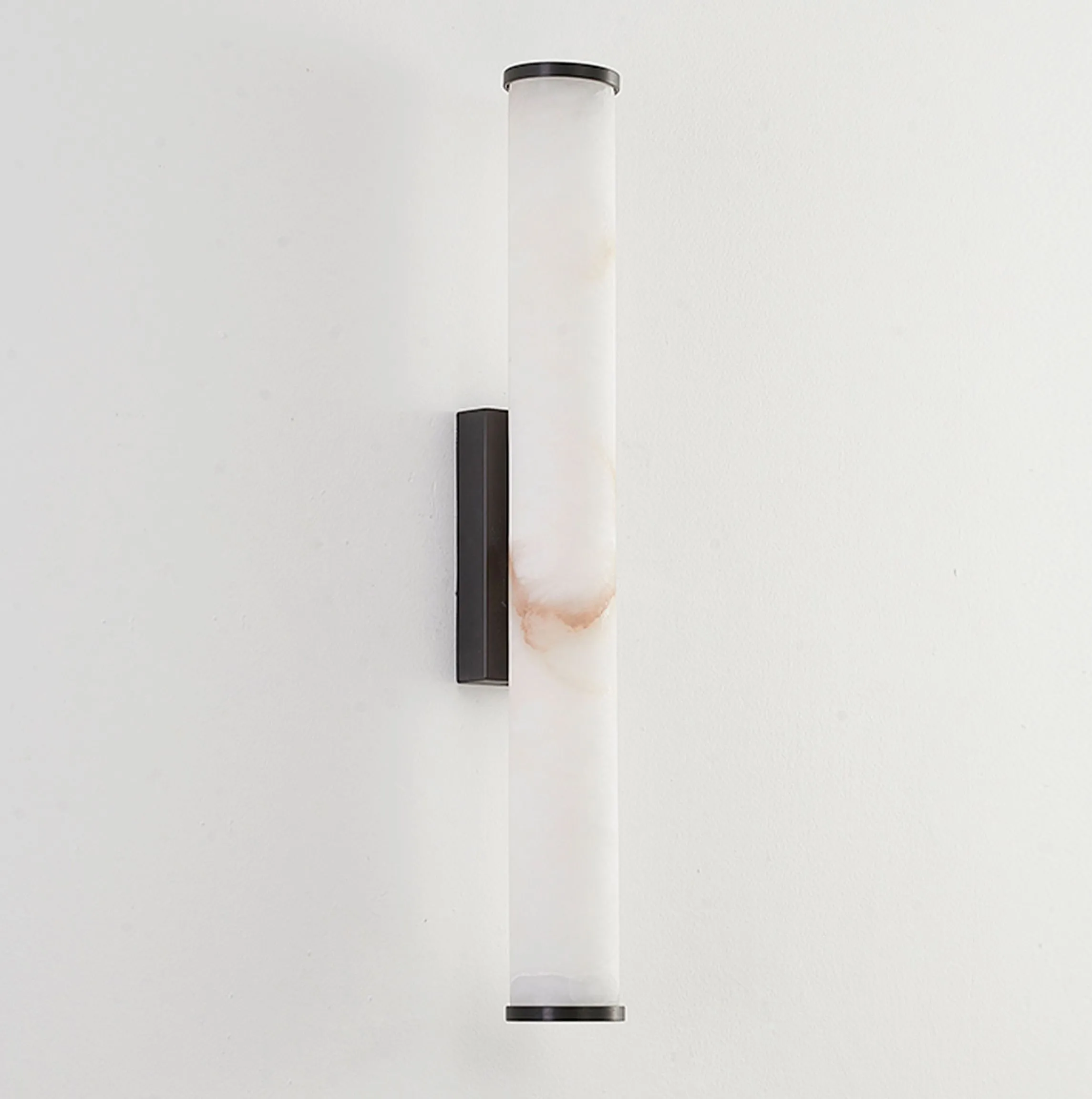 Главной особенностью светильника является его вытянутый цилиндрический плафон, выполненный из натурального мрамора. Этот природный материал придает светильнику особый шарм и делает его уникальным. Мраморный плафон обеспечивает мягкое рассеивание света, создавая уютную атмосферу в помещении. Вылет от стены - 10 см.