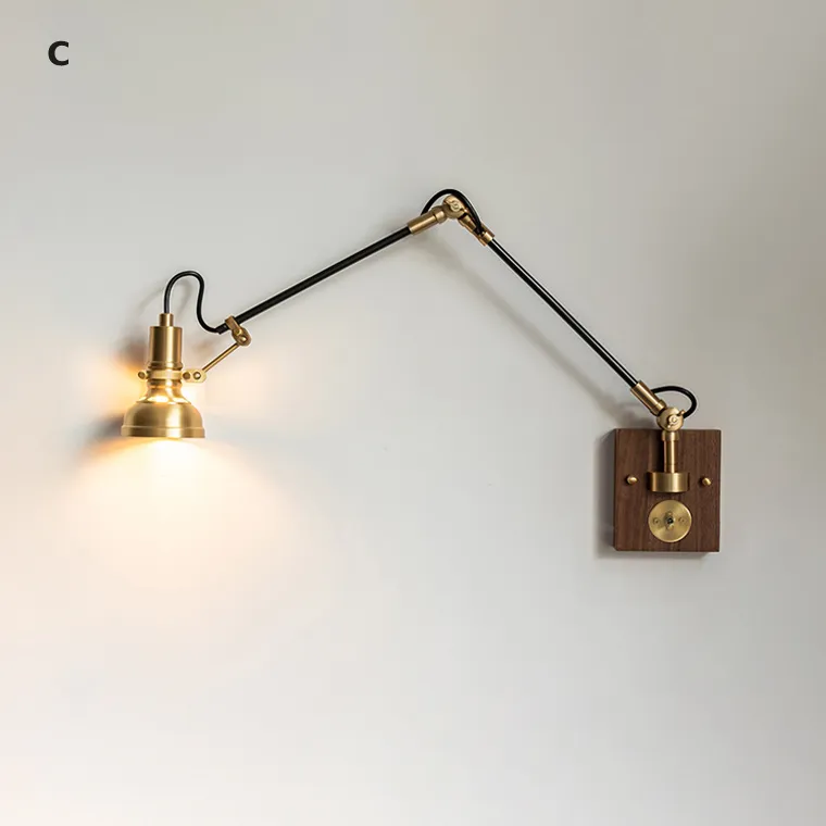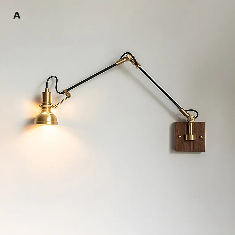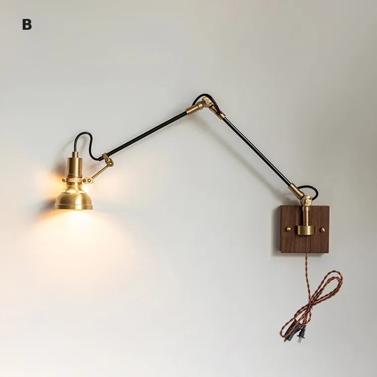 Бра с латунным плафоном цилиндрической формы на регулируемом кронштейне с деревянным креплением