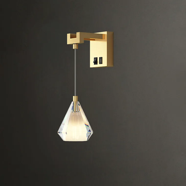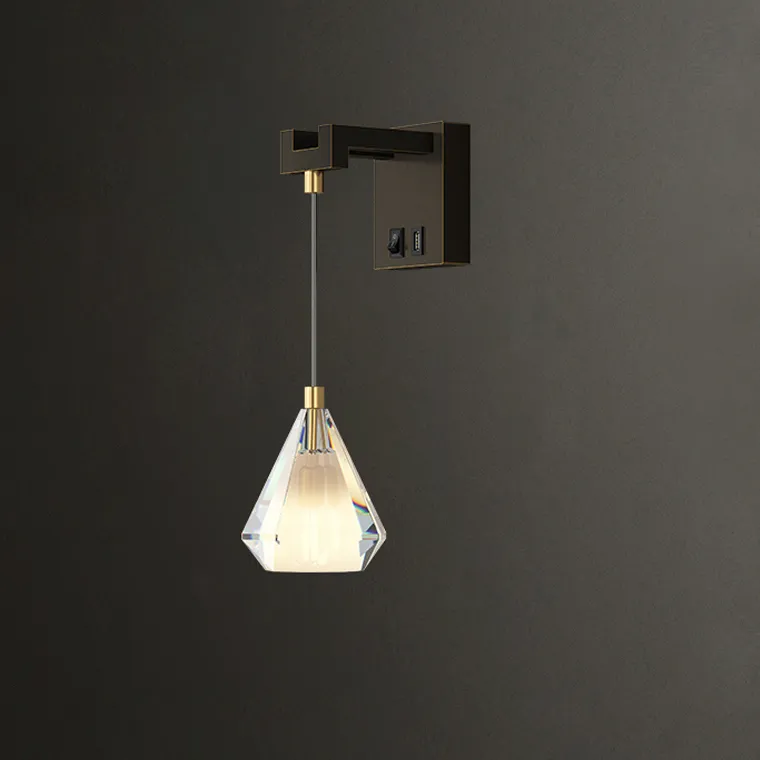 Настенный светильник с плафоном в виде хрустального камня на прямоугольном креплении с выключателем и USB-портом