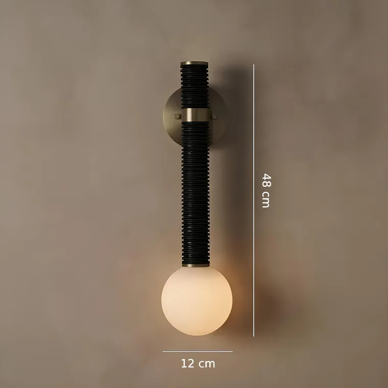 Серия настенных светильников с обтянутом кожей рельефным корпусом и белым шарообразным плафоном