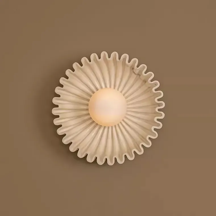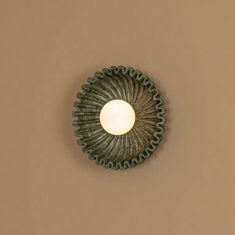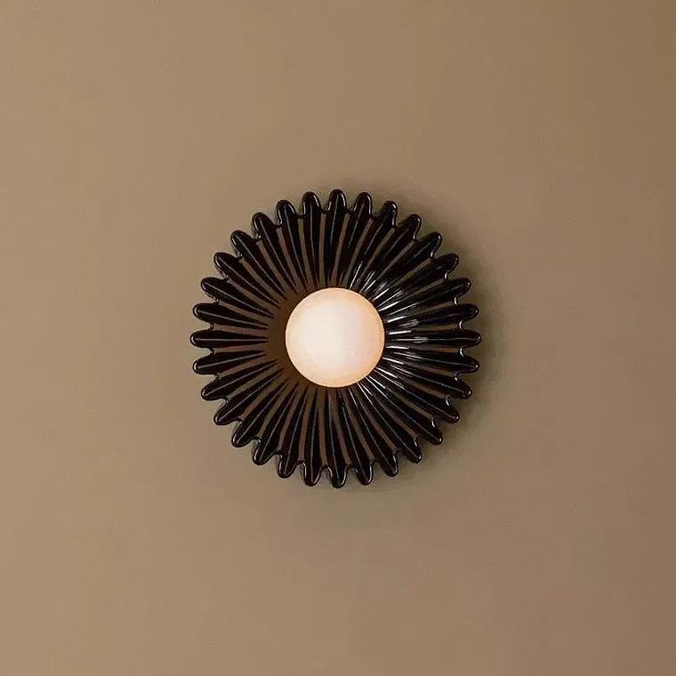 Серия настенных светильников с вогнутым рельефным корпусом из керамики и шарообразным плафоном в центре