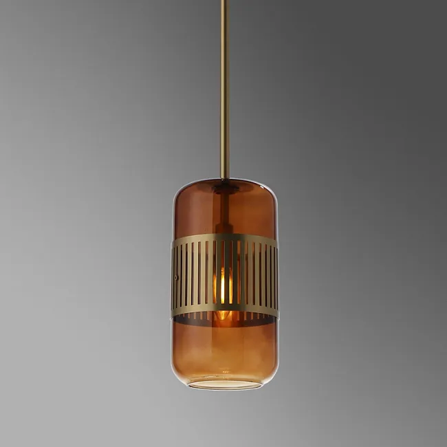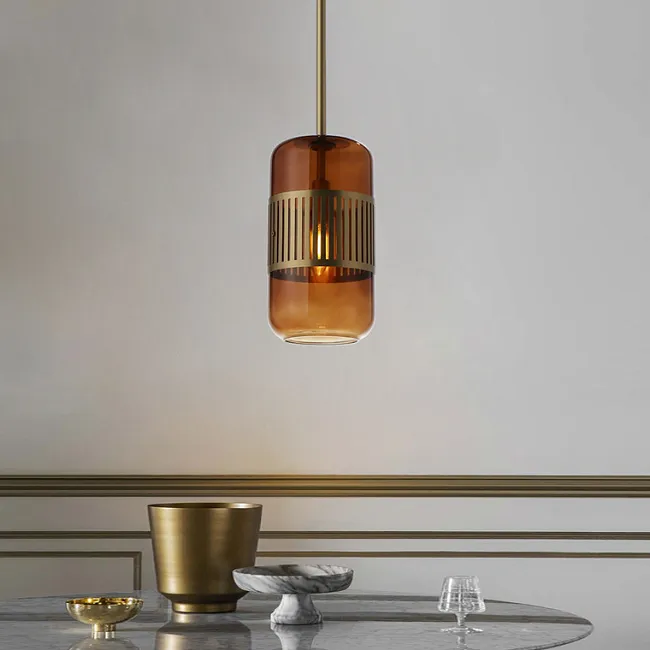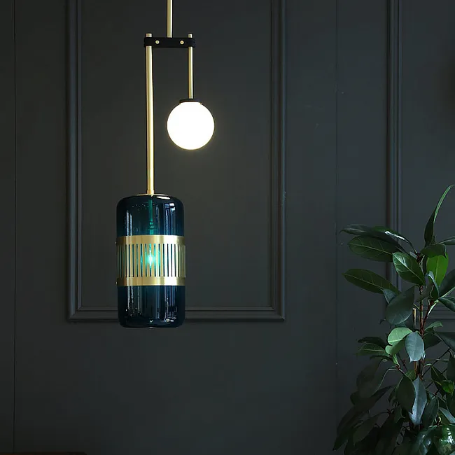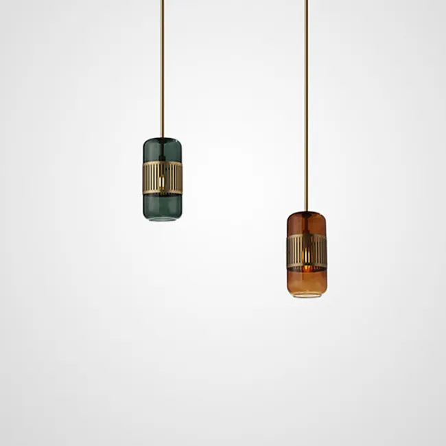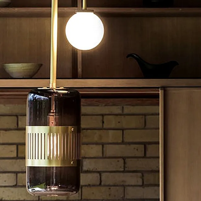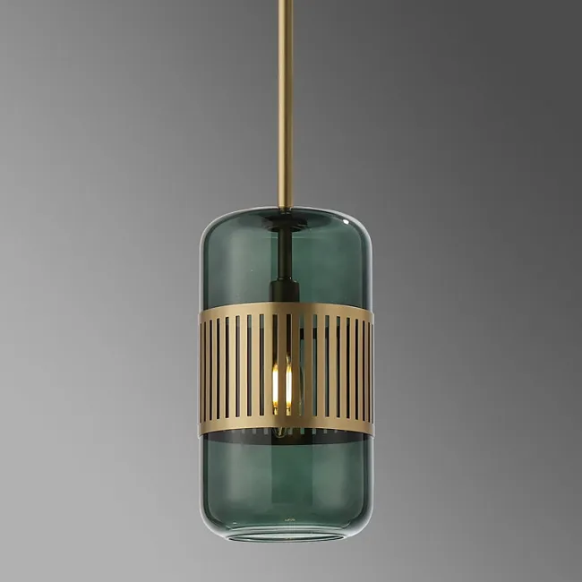 Настенный светильник с цилиндрическим плафоном из цветного стекла в металлическом обруче с вертикальными прорезями