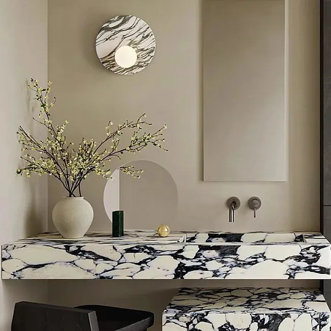 - Материал. Характерный рисунок может иметь не только натуральный мрамор, но и сланец, алебастр, стекло, акрил, дерево, травертин, полимеры, текстиль, хрусталь. В качестве дополнительных материалов для отдельных элементов используются экокожа, металлы, ткани.
