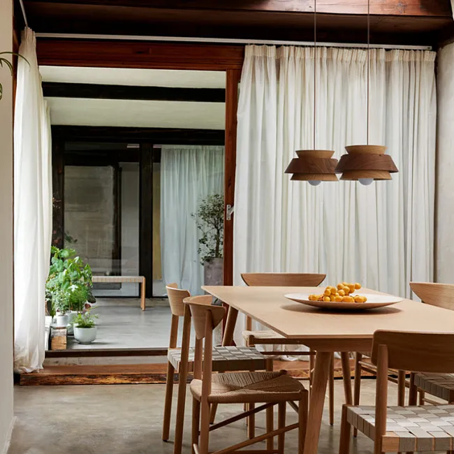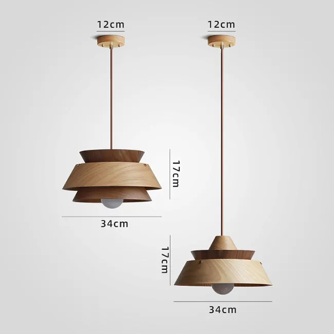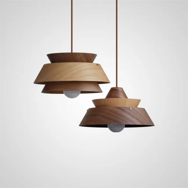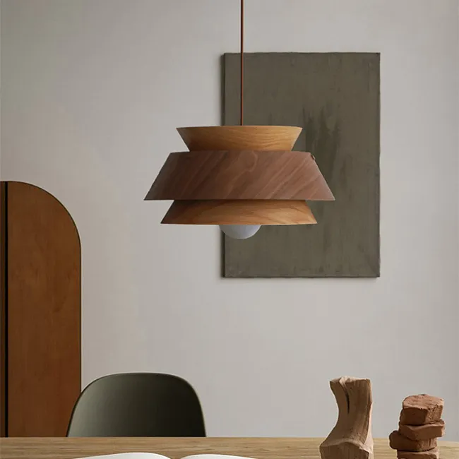 Готовая комбинация подвесных светильников с купольными абажурами из керамики и дерева с природными мотивами
