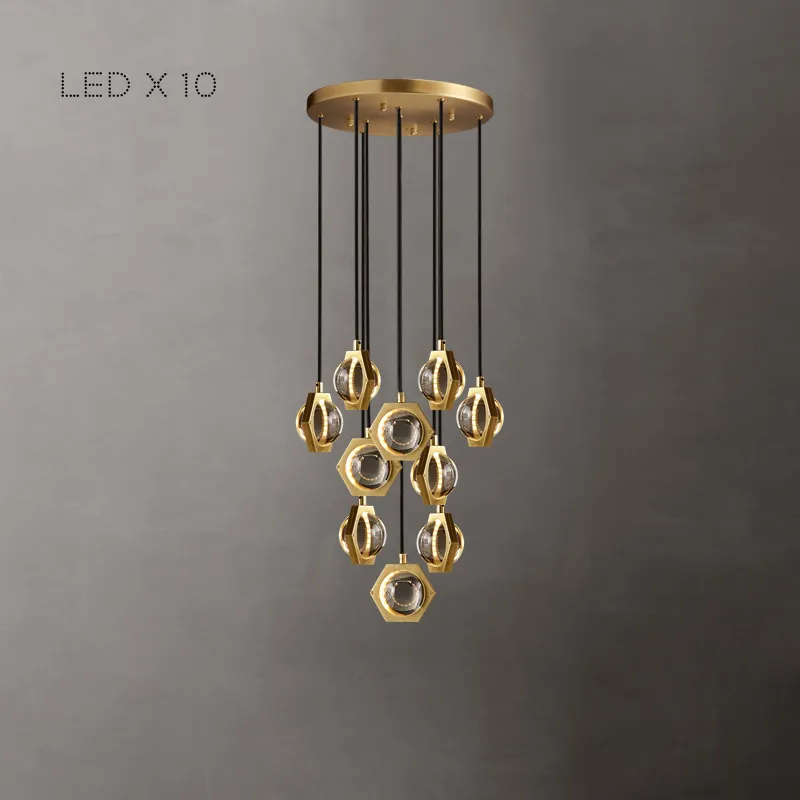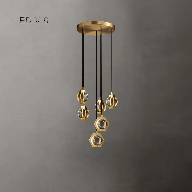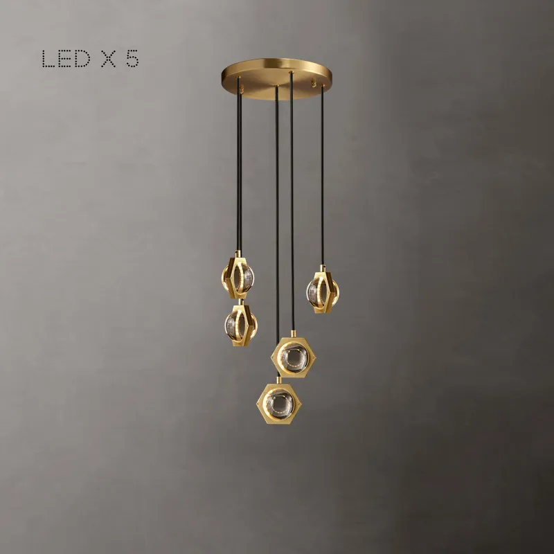 Готовая комбинация подвесных светильников с плафонами из цельных хрустальных сфер в металлических шестигранниках