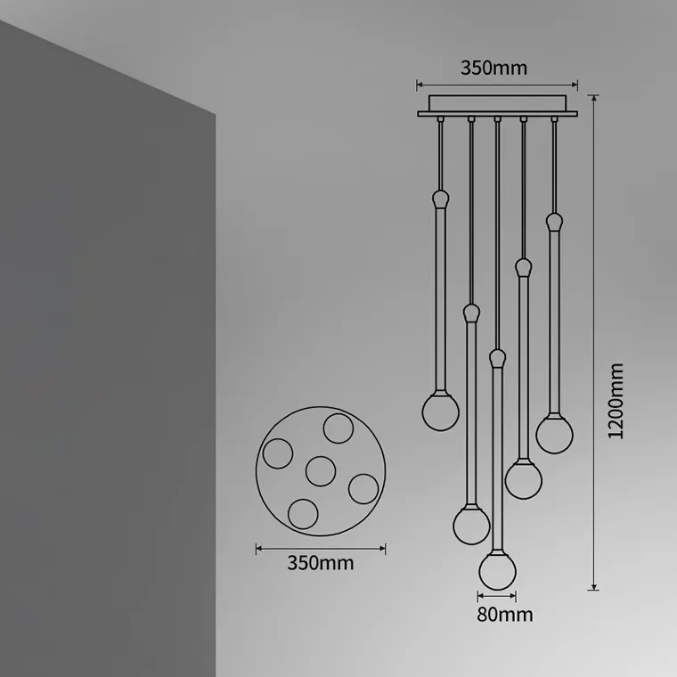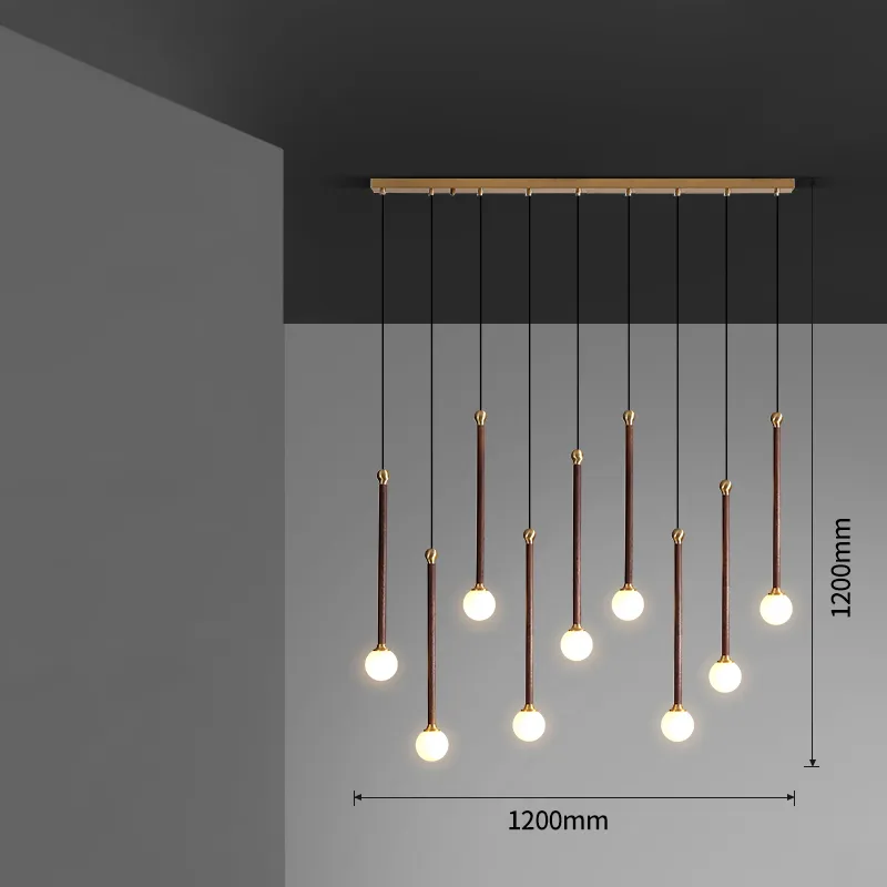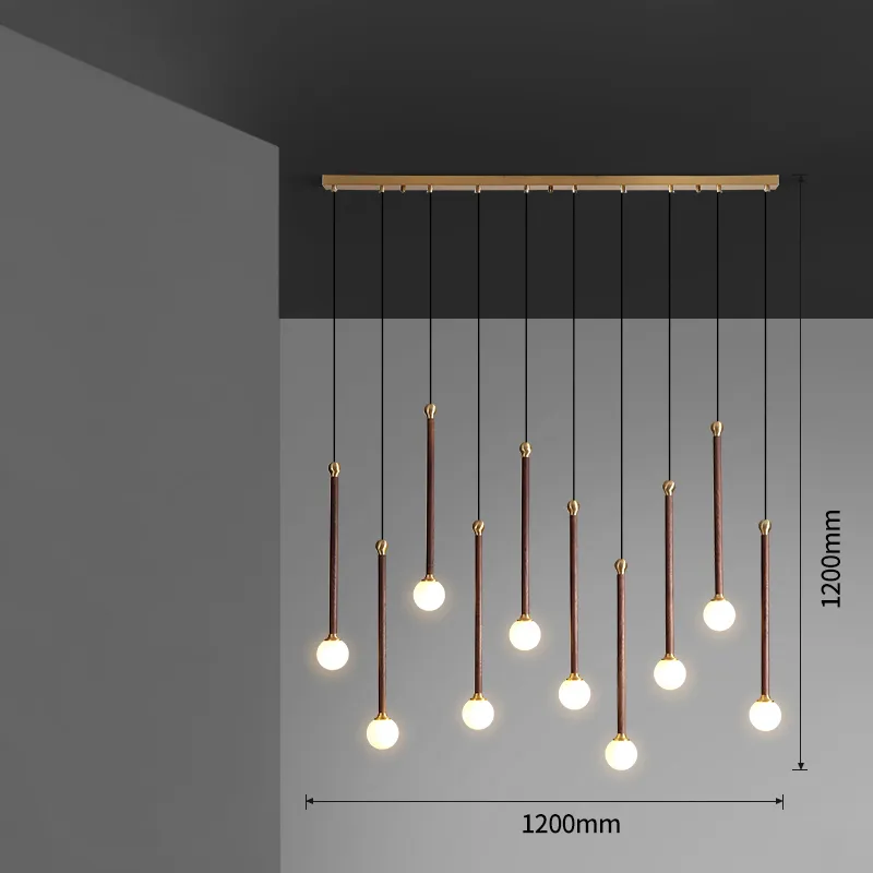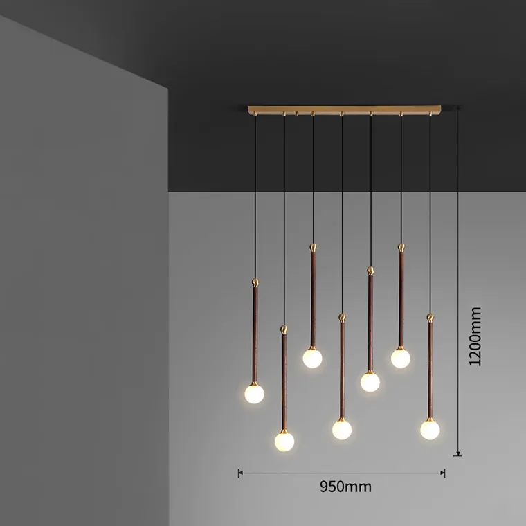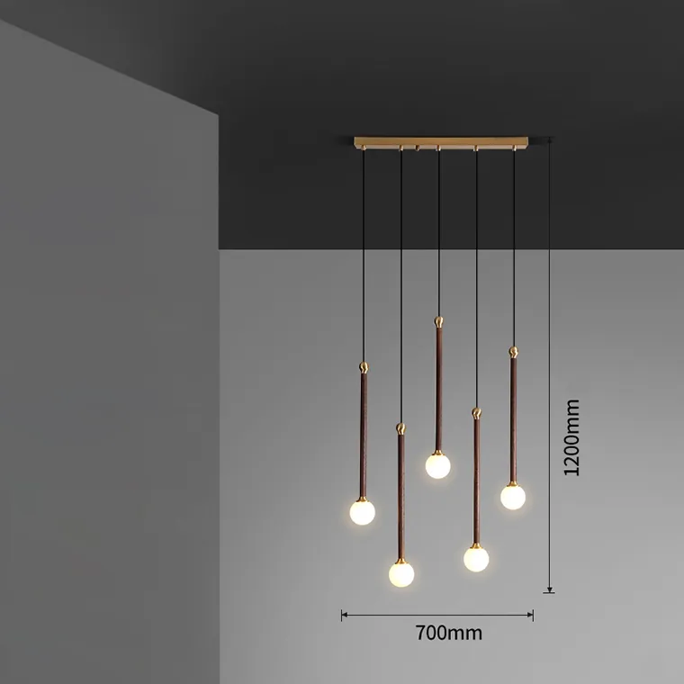 Готовая комбинация подвесных светильников с латунным элементом на удлиненном деревянном корпусе и шарообразным матовым плафоном