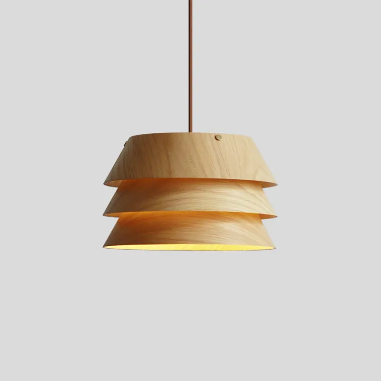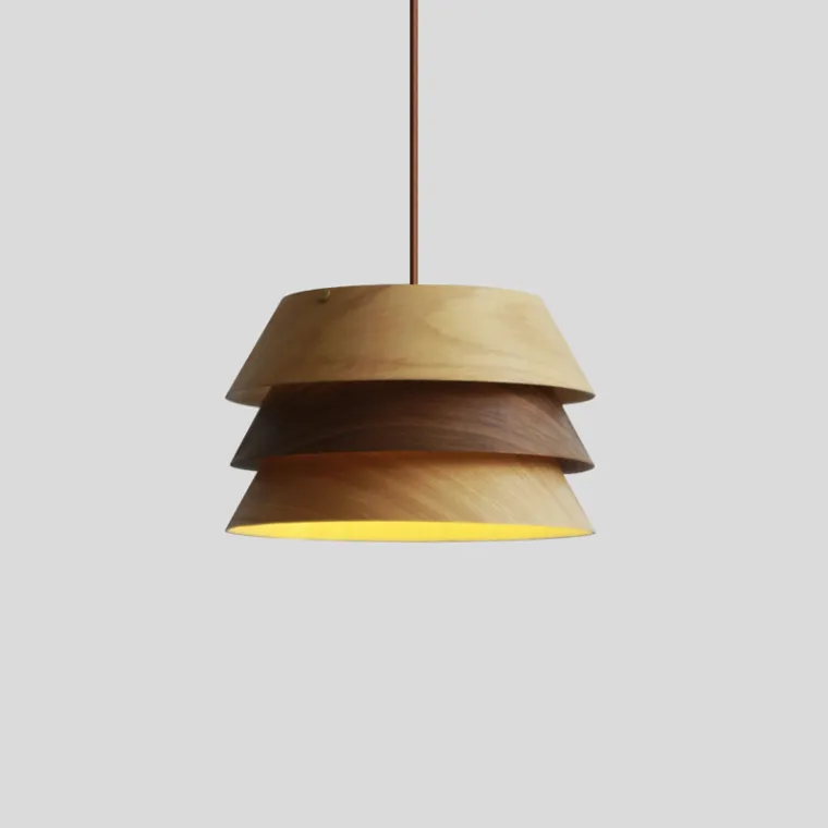 Серия подвесных светильников с трехслойным абажуром купольной формы из темного и светлого дерева