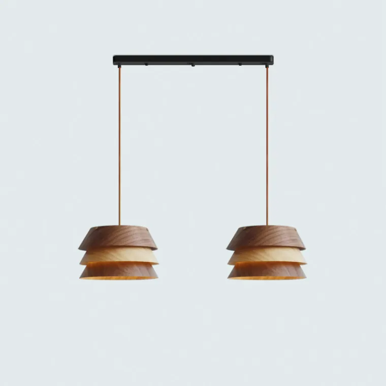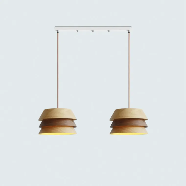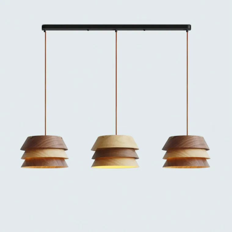 Готовая комбинация подвесных светильников c трехслойными абажурами из темного и светлого дерева
