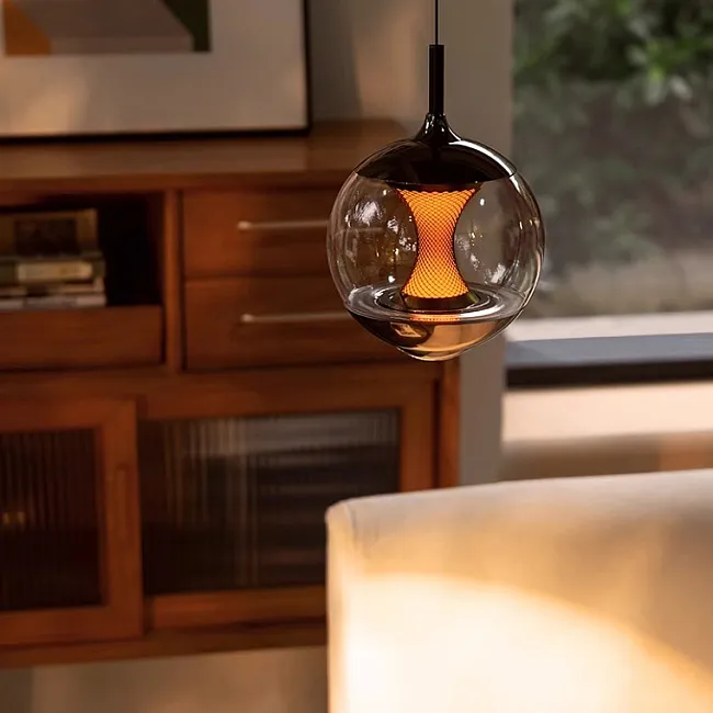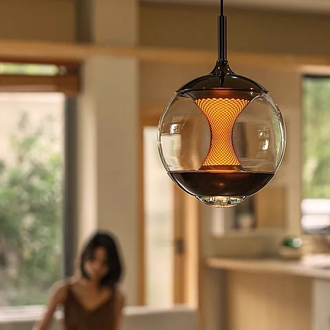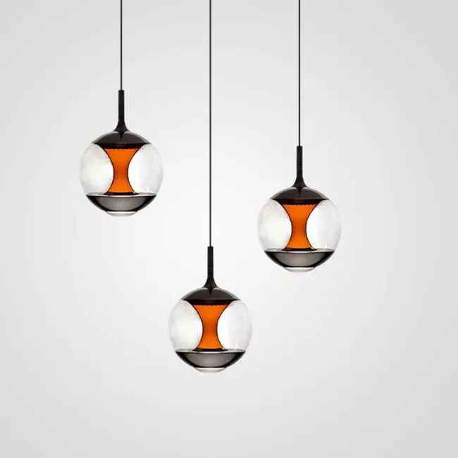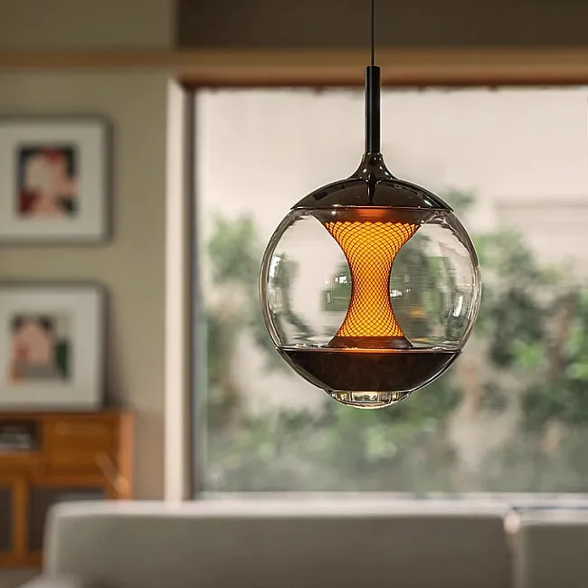 Светодиодный подвесной светильник в форме шара с линзированным и центральным шарообразным источником света с декоративной апертурной решеткой