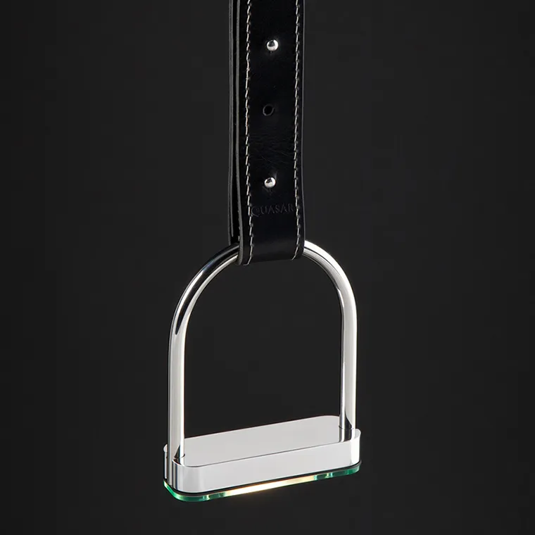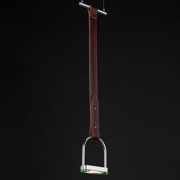Подвесной светильник в минималистичном стиле в хромированном прямоугольным корпусе на кожанном подвесе