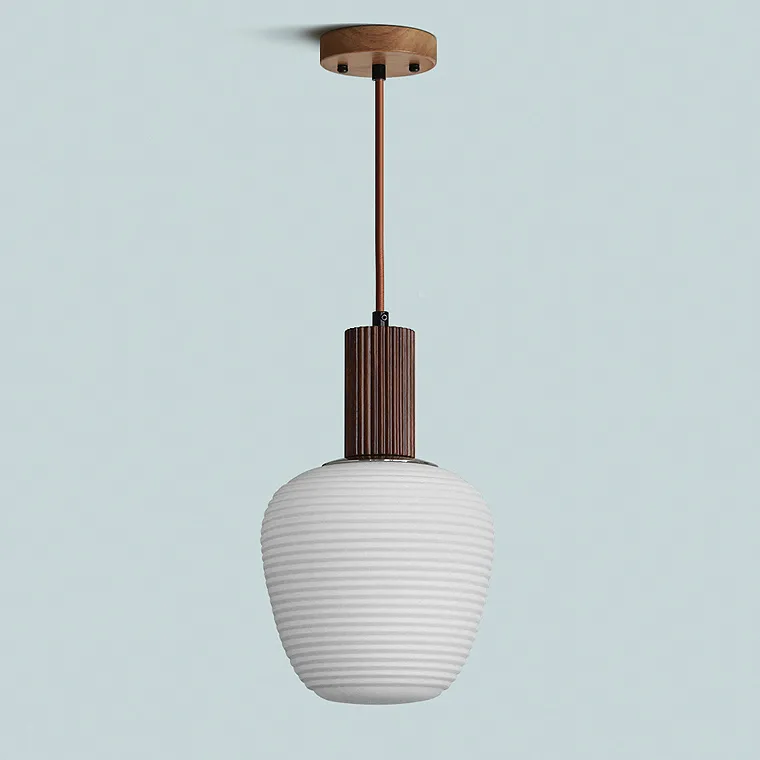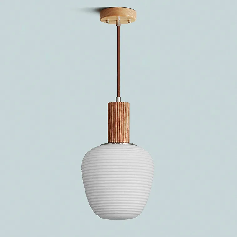 Серия подвесных светильников с белым плафоном из рельефного стекла и деревянной отделкой