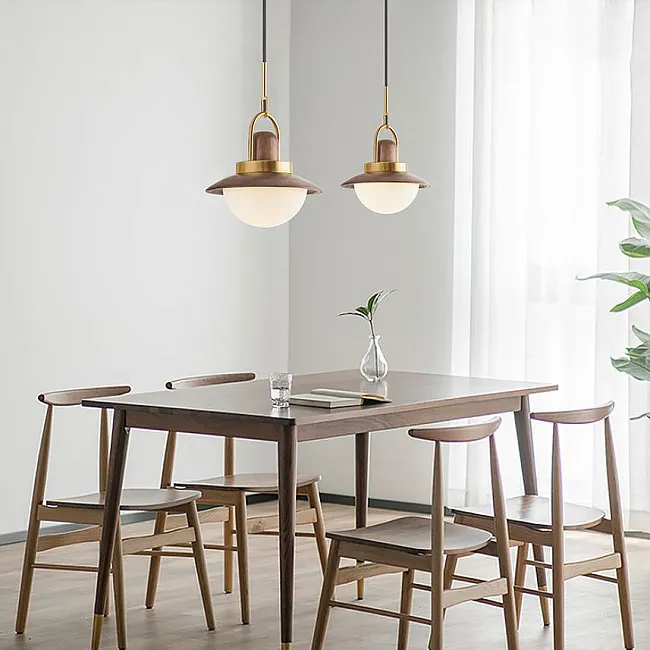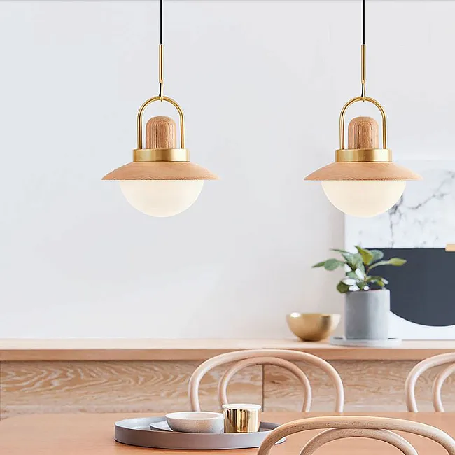 Серия подвесных светильников с белым плафоном из рельефного стекла и деревянной отделкой