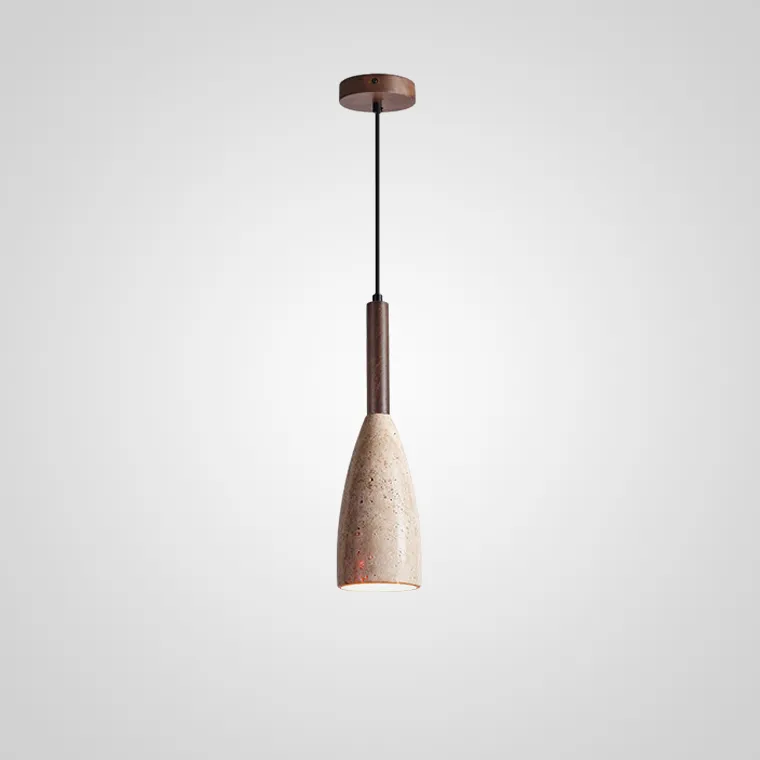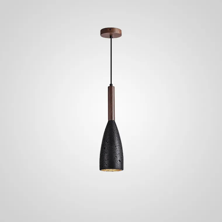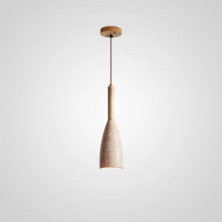 Серия подвесных светильников с каменным корпусом в форме кегли на креплении из темного и светлого дерева
