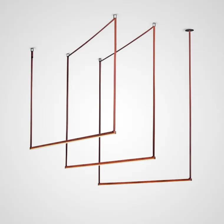 Готовая комбинация подвесных светодиодных светильников c тремя прямоугольными рейками на коричневом тросе