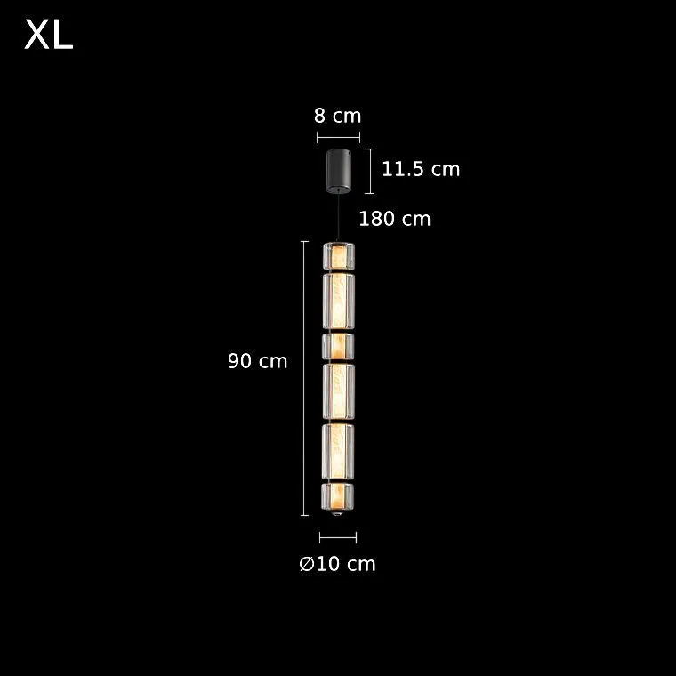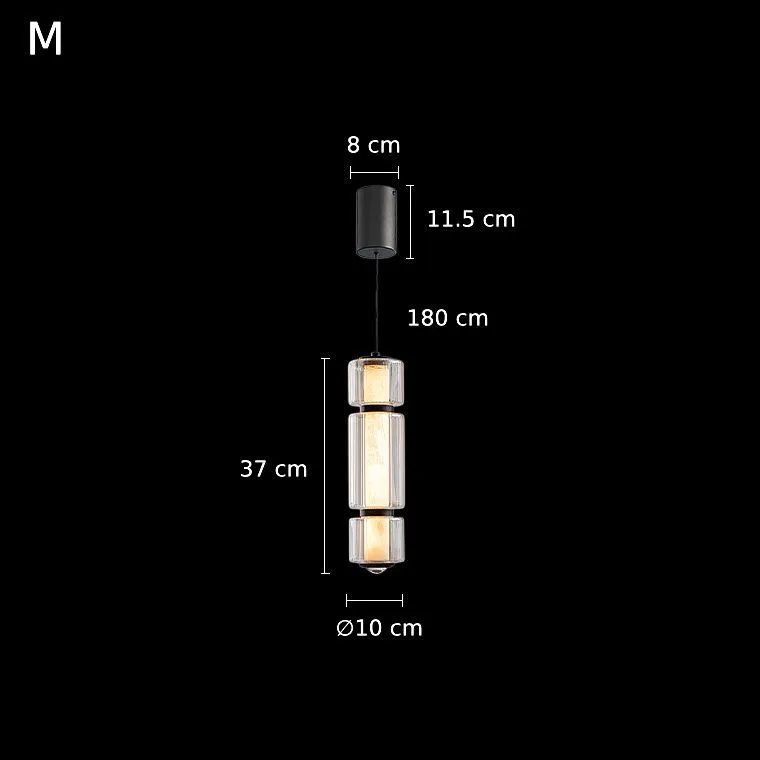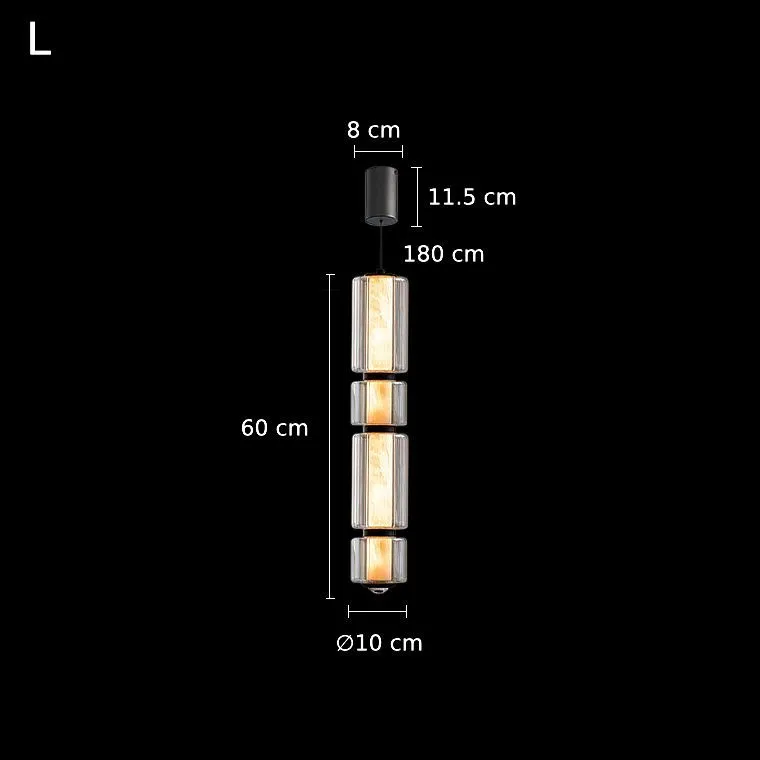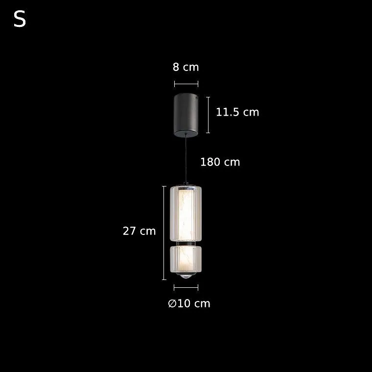 Серия подвесных светильников с секциями цилиндров из стекла со спектральными переливами и внутренними рассеивателями из мрамора с точечным источником света на конце