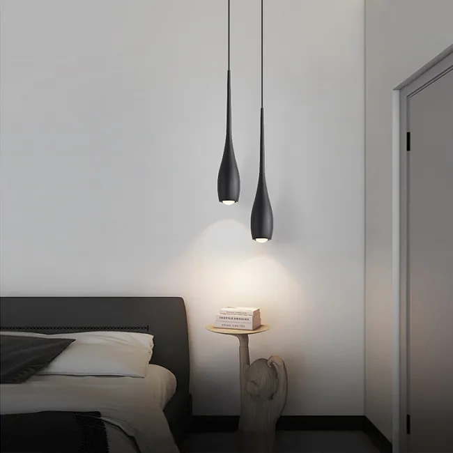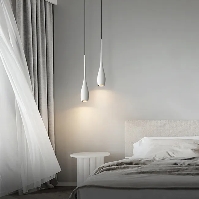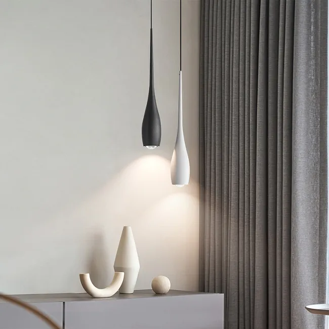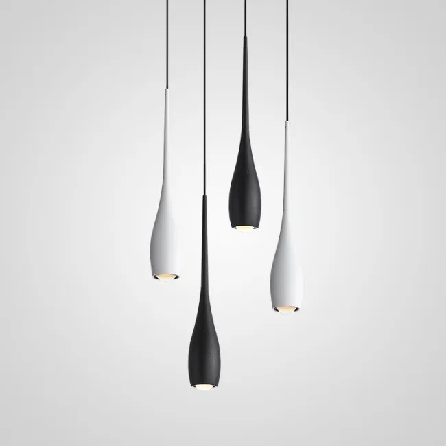 Серия подвесных светильников с секциями цилиндров из стекла со спектральными переливами и внутренними рассеивателями из мрамора с точечным источником света на конце