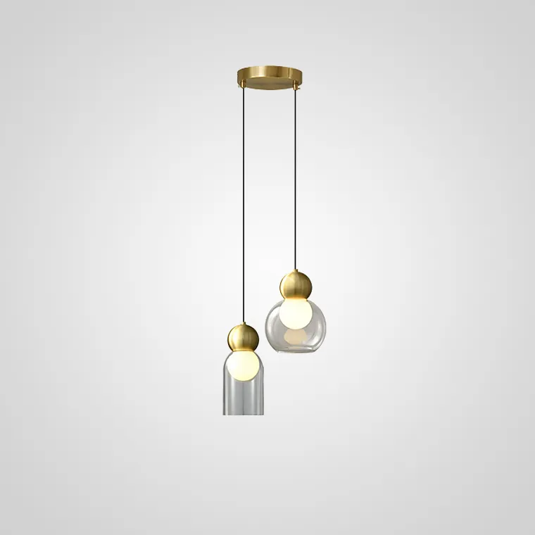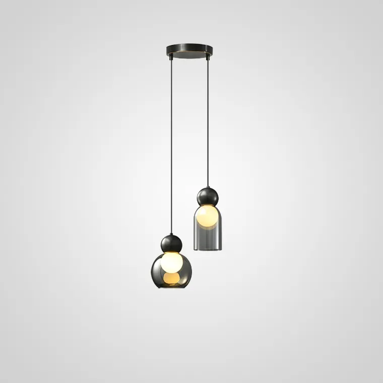 Готовая комбинация подвесных светильников с двумя шарообразными плафонами в стеклянным корпусе из дымчатого и прозрачного стекла