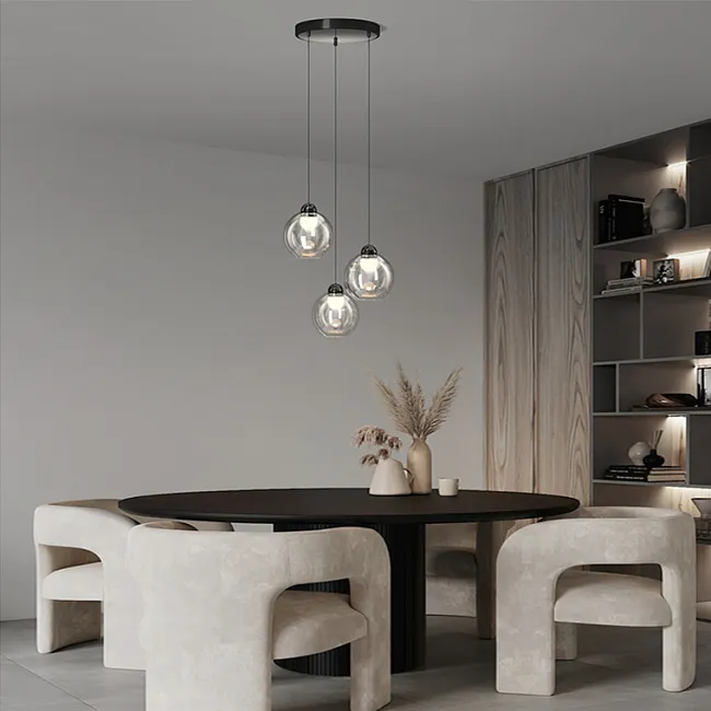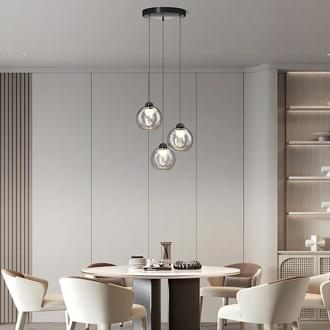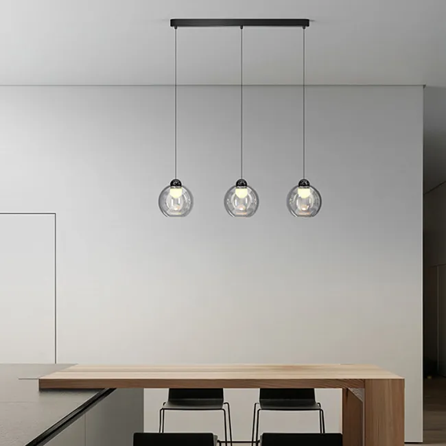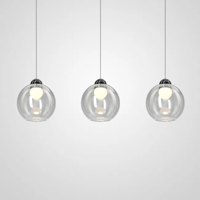 Готовая комбинация подвесных светильников с двумя шарообразными плафонами в стеклянным корпусе из дымчатого и прозрачного стекла
