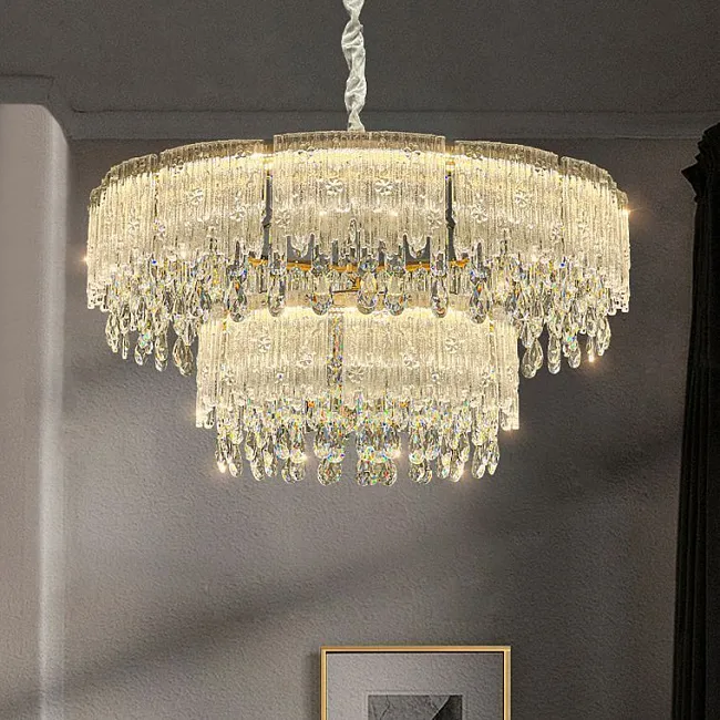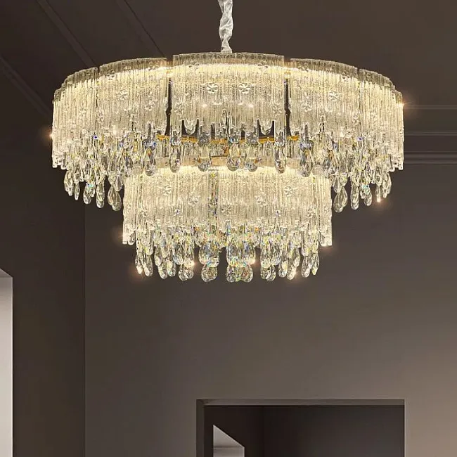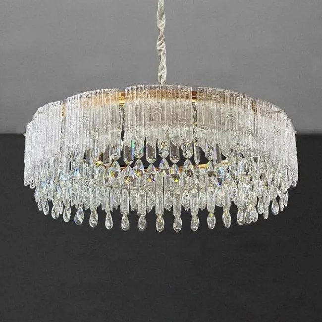 Элегантный подвесной светильник в форме свечи с основанием в виде хрустальной декоративной чаши, украшенной подвесками в виде капель
