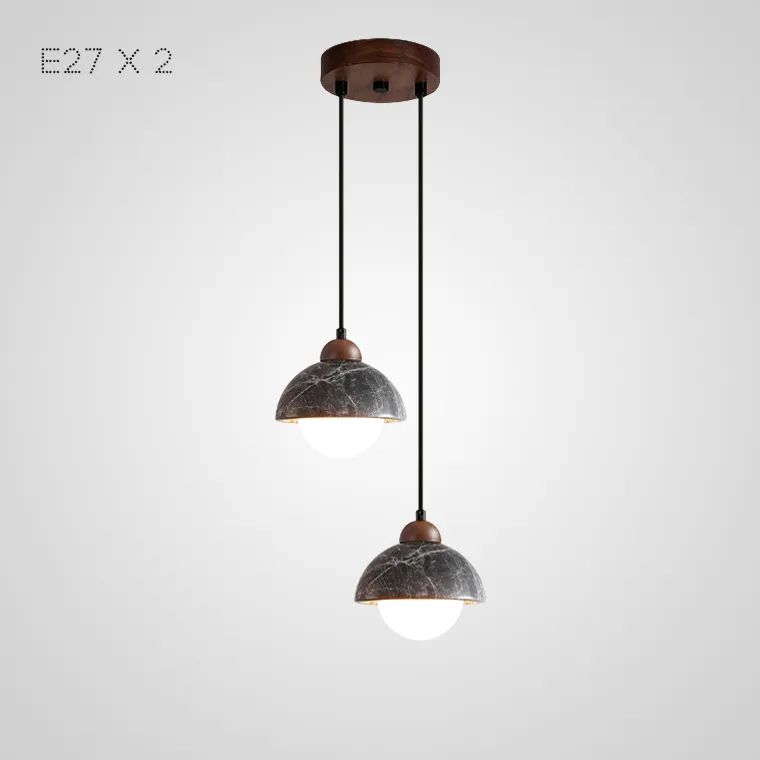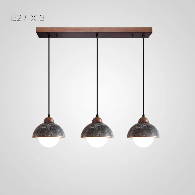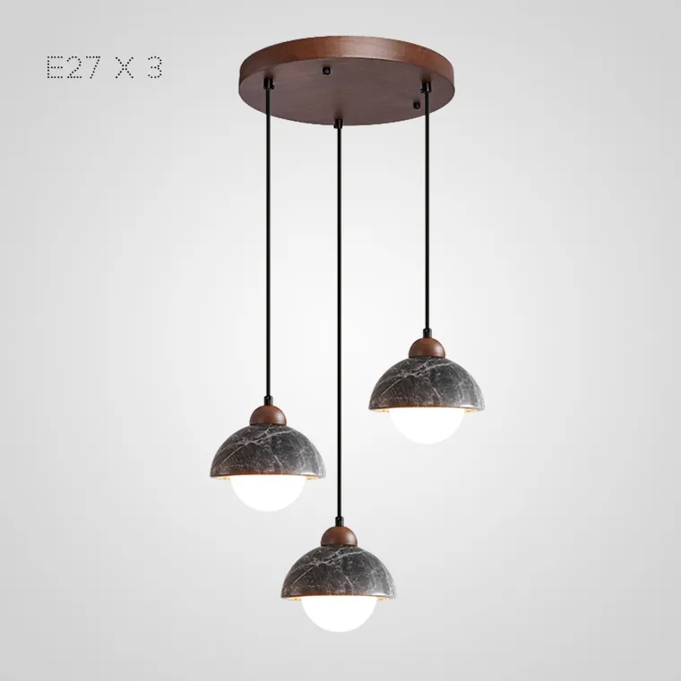 Готовая комбинация подвесных светильников с шарообразными плафонами и комбинированными абажурами из мрамора и дерева