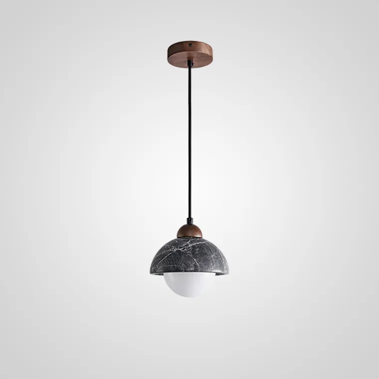 Подвесной светильник с шарообразным стеклянным плафоном и комбинированным абажуром из мрамора и дерева