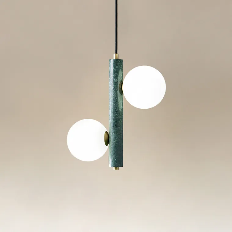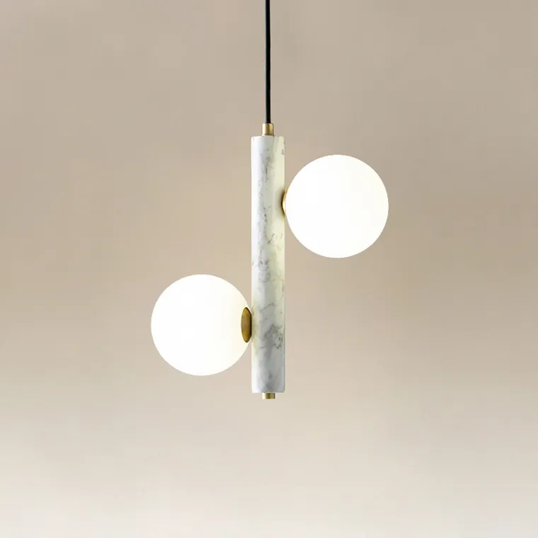 Серия подвесных светильников с шарообразными плафонами на цилиндрическом основании из мрамора