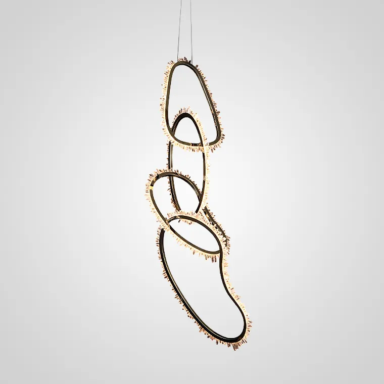 Светодиодная инсталляция в виде пересекающихся колец различной формы на струнном подвесе с натуральными хрустальными камнями на внешнем контуре
