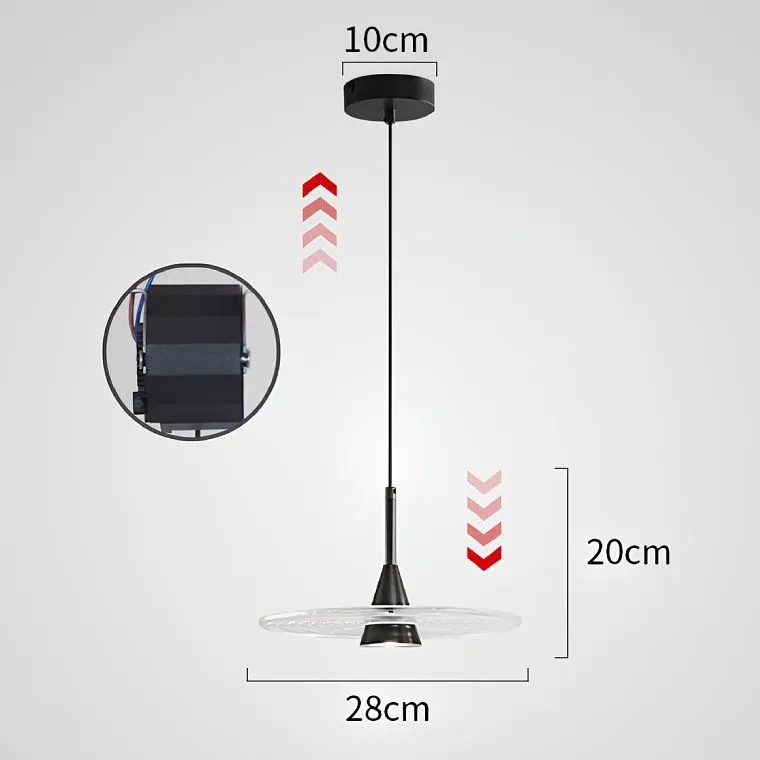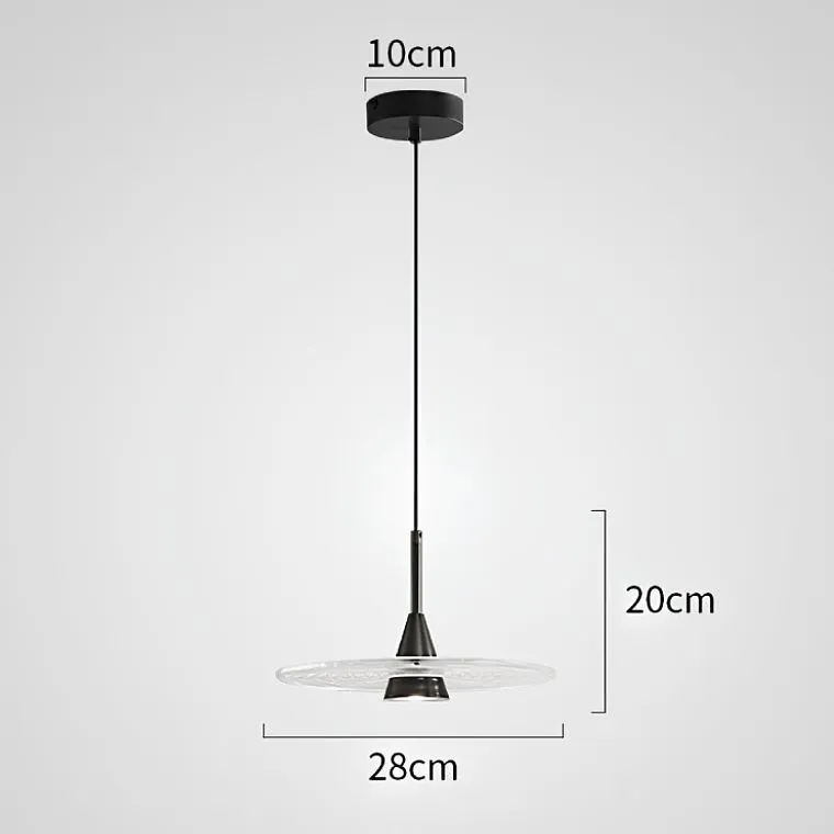 Светодиодный подвесной светильник в виде конического плафона в середине диска из стекла с концентрическим рельефом