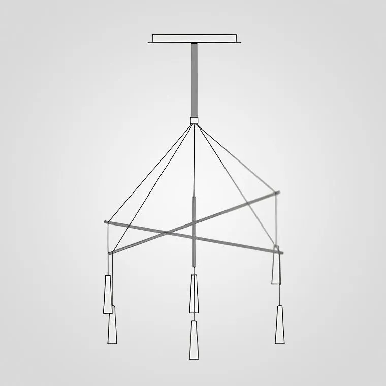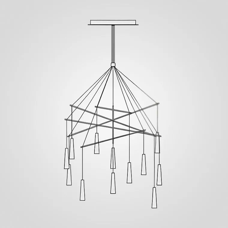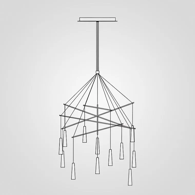 Черный строгий цвет, минималистичный стиль и отсылка к индустриальному шарму лофта. Его конструкция словно парит в воздухе, будто ожившая графика: один центральный несущий стержень, из которого расходятся тонкие подвесы. Каждый из них завершается узким черным конусом, направленным вниз, словно лучи света, пронзающие пространство.