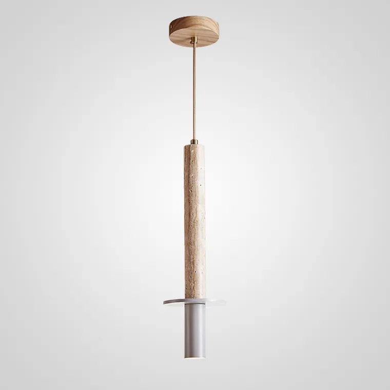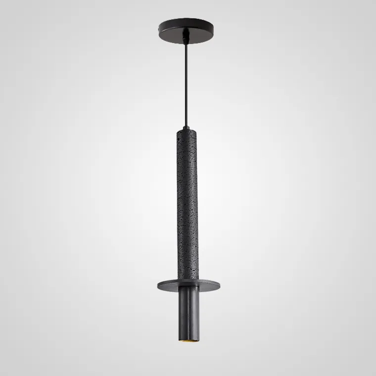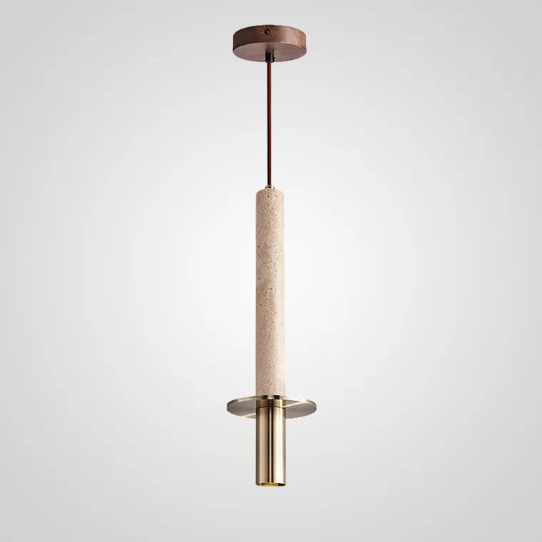 Серия подвесных светильников с цилиндрическим корпусом из лавового камня и травертина с дисковидным рассеивателем