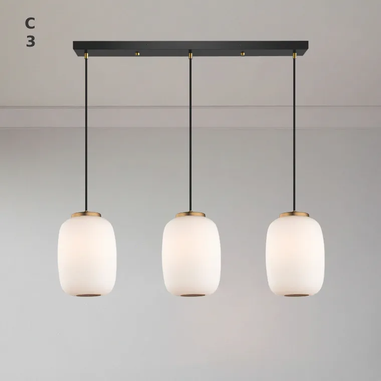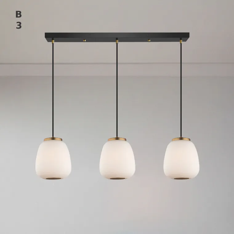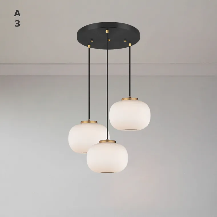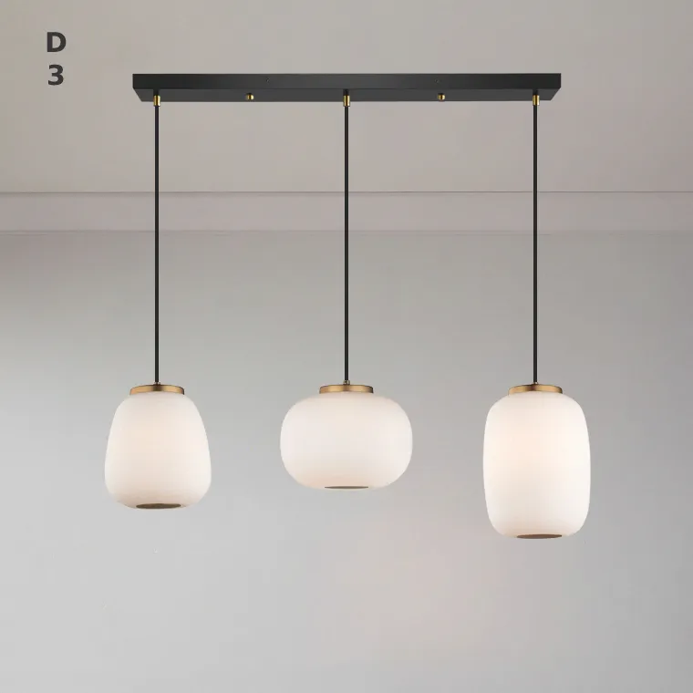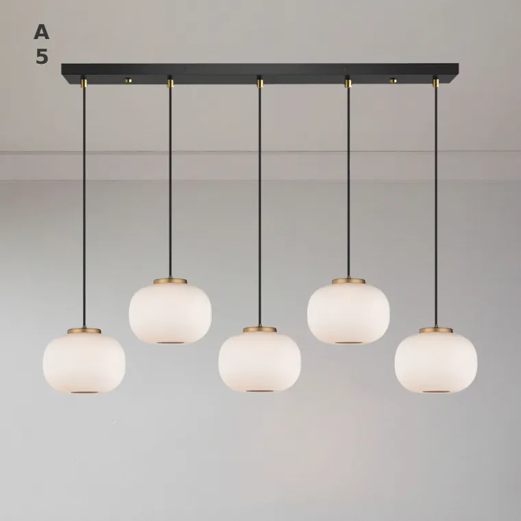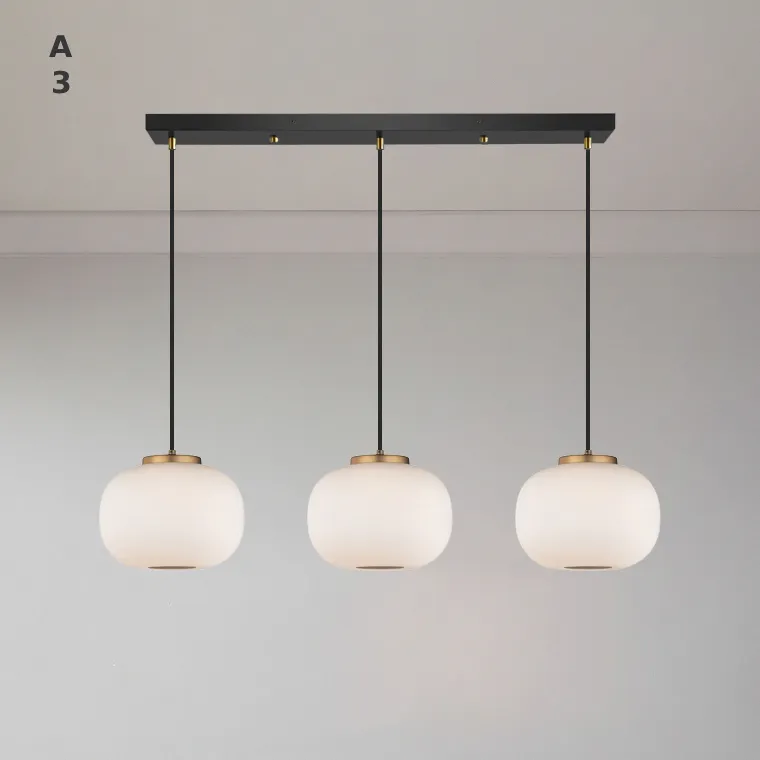 Готовая комбинация подвесных светодиодных светильников c белыми шарообразными плафонами из матового стекла
