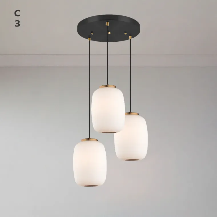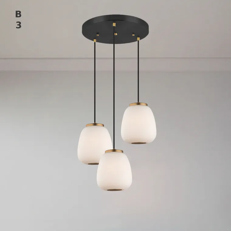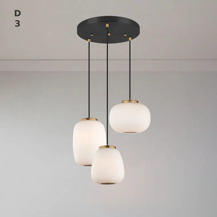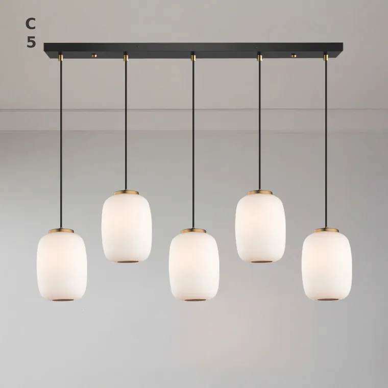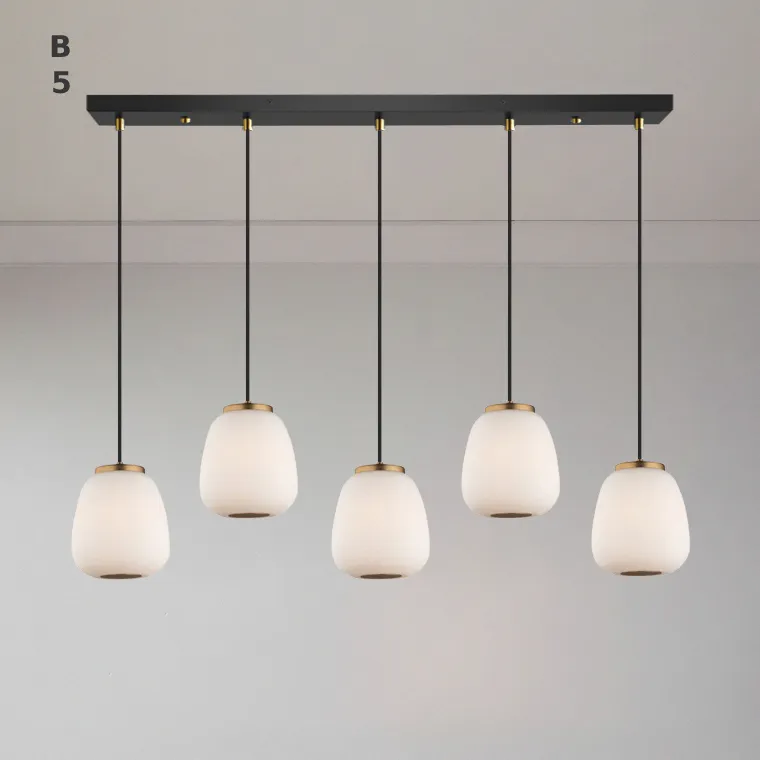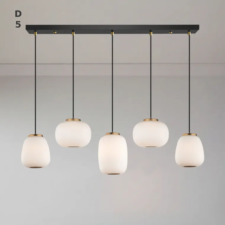 Готовая комбинация подвесных светодиодных светильников c белыми шарообразными плафонами из матового стекла