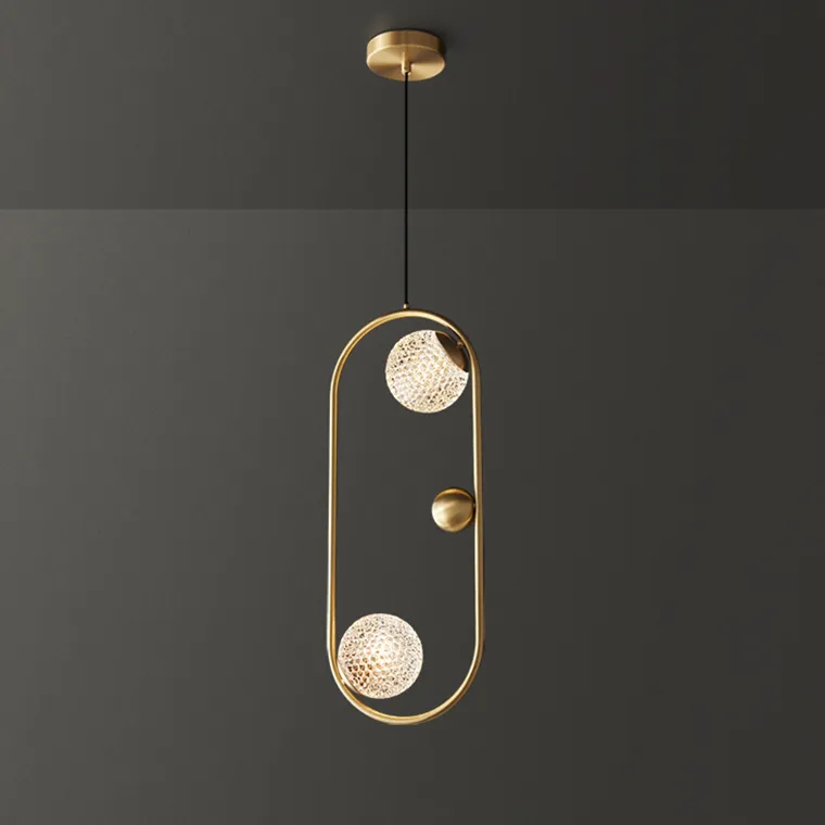 Подвесной светильник с двумя шарообразными плафонами с кристаллическим рельефом и декоративным металлическим шаром на овальном каркасе