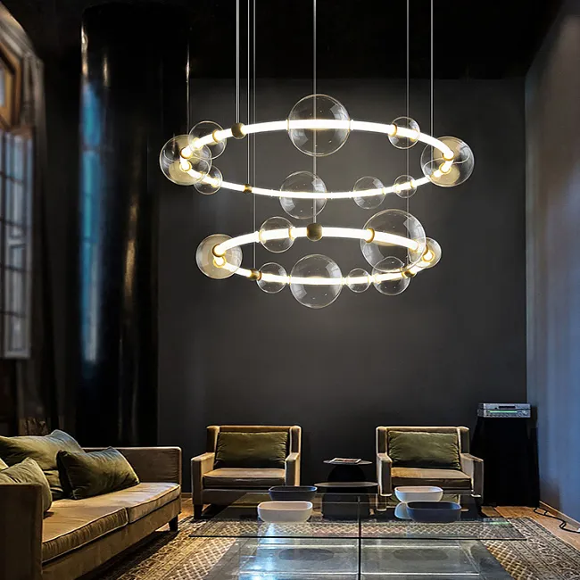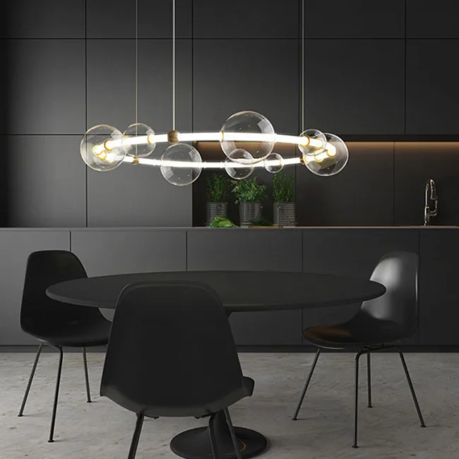 Выбрали эту люстру для помещения с высокими потолками — подошла идеально благодаря стойке - 79 см. А прозрачные шары делают конструкцию визуально лёгкой, но в то же время необычной