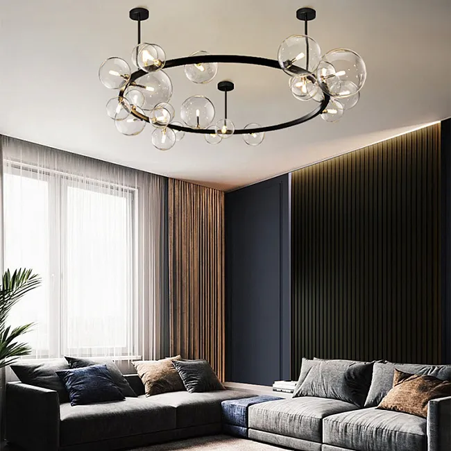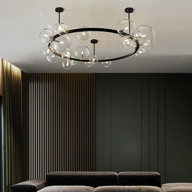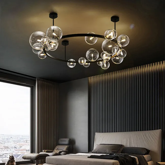 Этот светильник — просто космос! Чем-то напоминает Сатурн, а прозрачные шары-плафоны вокруг — нежно и неожиданно, это главный акцент в комнате
