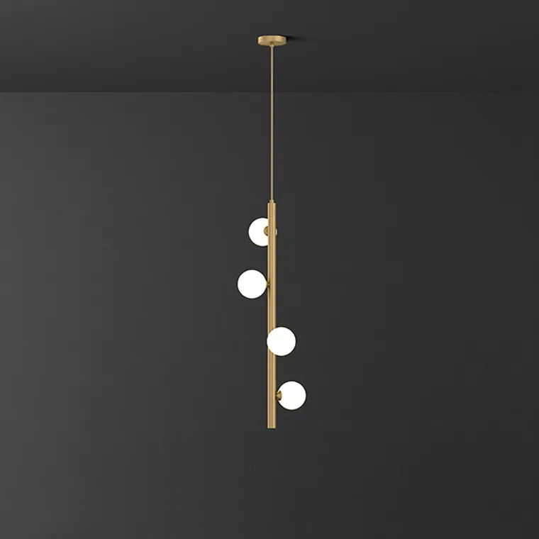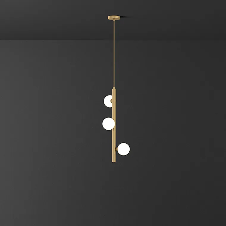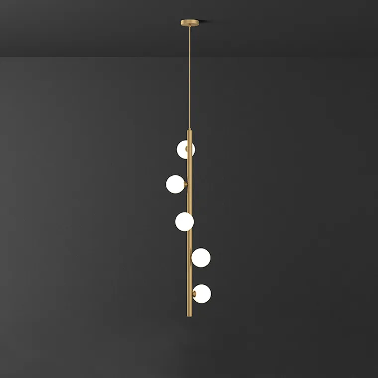 Серия дизайнерских светильников с белыми шарообразными плафонами из стекла на латунном трубчатом корпусе